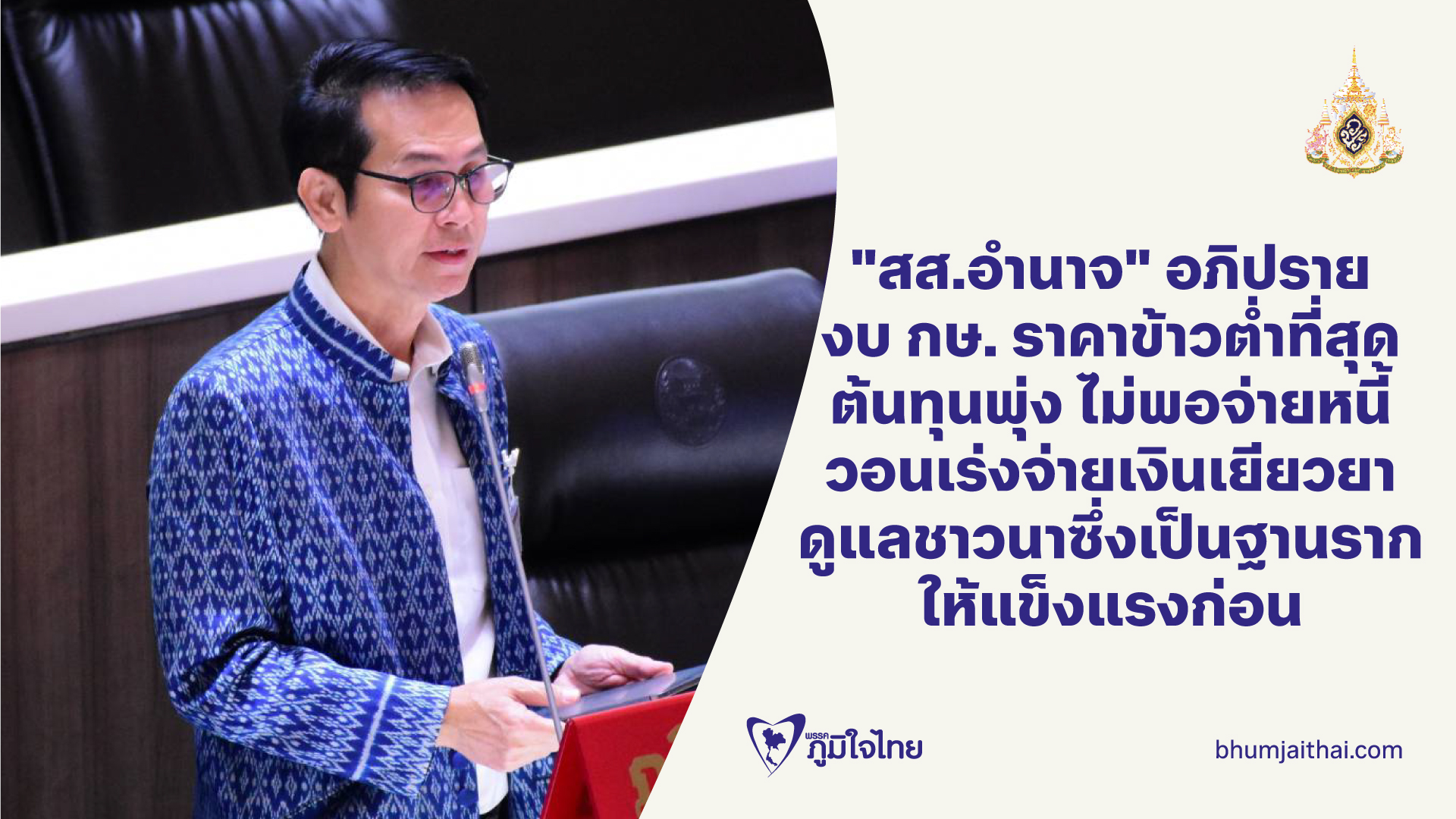"สส.อำนาจ" อภิปราย งบ กษ. ราคาข้าวต่ำที่สุด ต้นทุนพุ่ง ไม่พอจ่ายหนี วอนเร่งจ่ายเงินเยียวยา ดูแลชาวนาซึ่งเป็นฐานราก ให้แข็งแรงก่อน