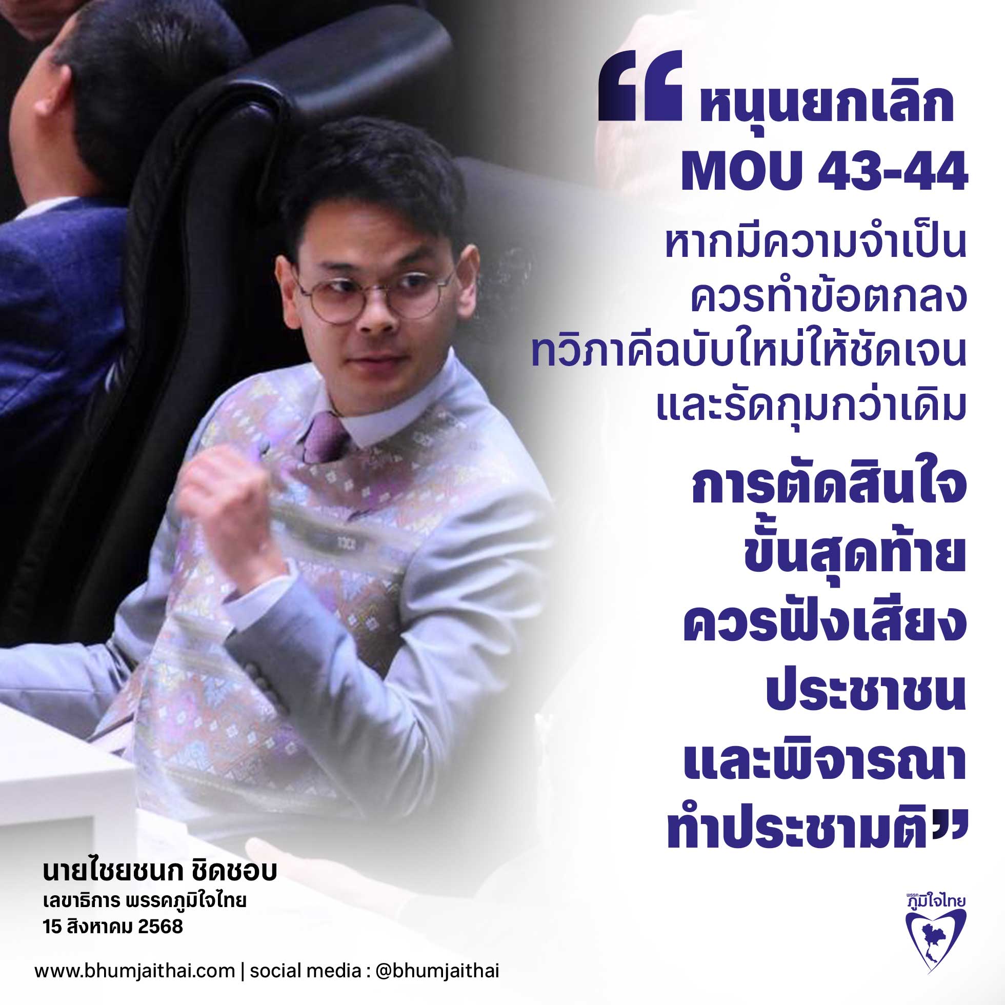 วันที่ 15 สิงหาคม 2568 นายไชยชนก ชิดชอบ เลขาธิการพรรคภูมิใจไทย แสดงจุดยืนชัด หนุนให้มีการยกเลิกบันทึกความเข้าใจ (MOU) ปี 2543 และ 2544 ระหว่างไทยกับกัมพูชา โดยให้เหตุผลว่า สถานการณ์ปัจจุบันไม่เป็นผลดีต่อไทย หวั่นผลประโยชน์สองตระกูลทับซ้อน และการคงไว้ซึ่ง MOU ดังกล่าวอาจกลายเป็นชนวนปัญหาใหญ่ด้านดินแดนในอนาคต