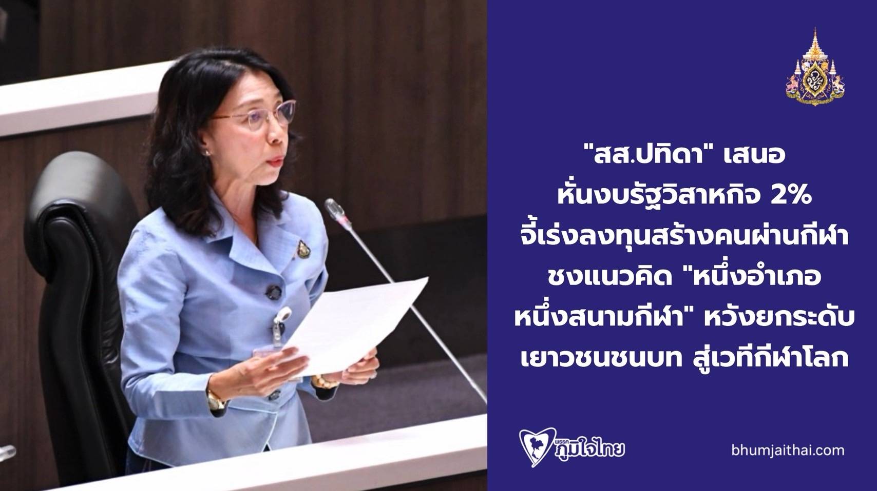 "สส.ปทิดา " เสนอหั่นงบรัฐวิสาหกิจ 2% จี้เร่งลงทุนสร้างคนผ่านกีฬา ชงแนวคิด "หนึ่งอำเภอ หนึ่งสนามกีฬา" หวังยกระดับเยาวชนชนบทสู่เวทีกีฬาโลก