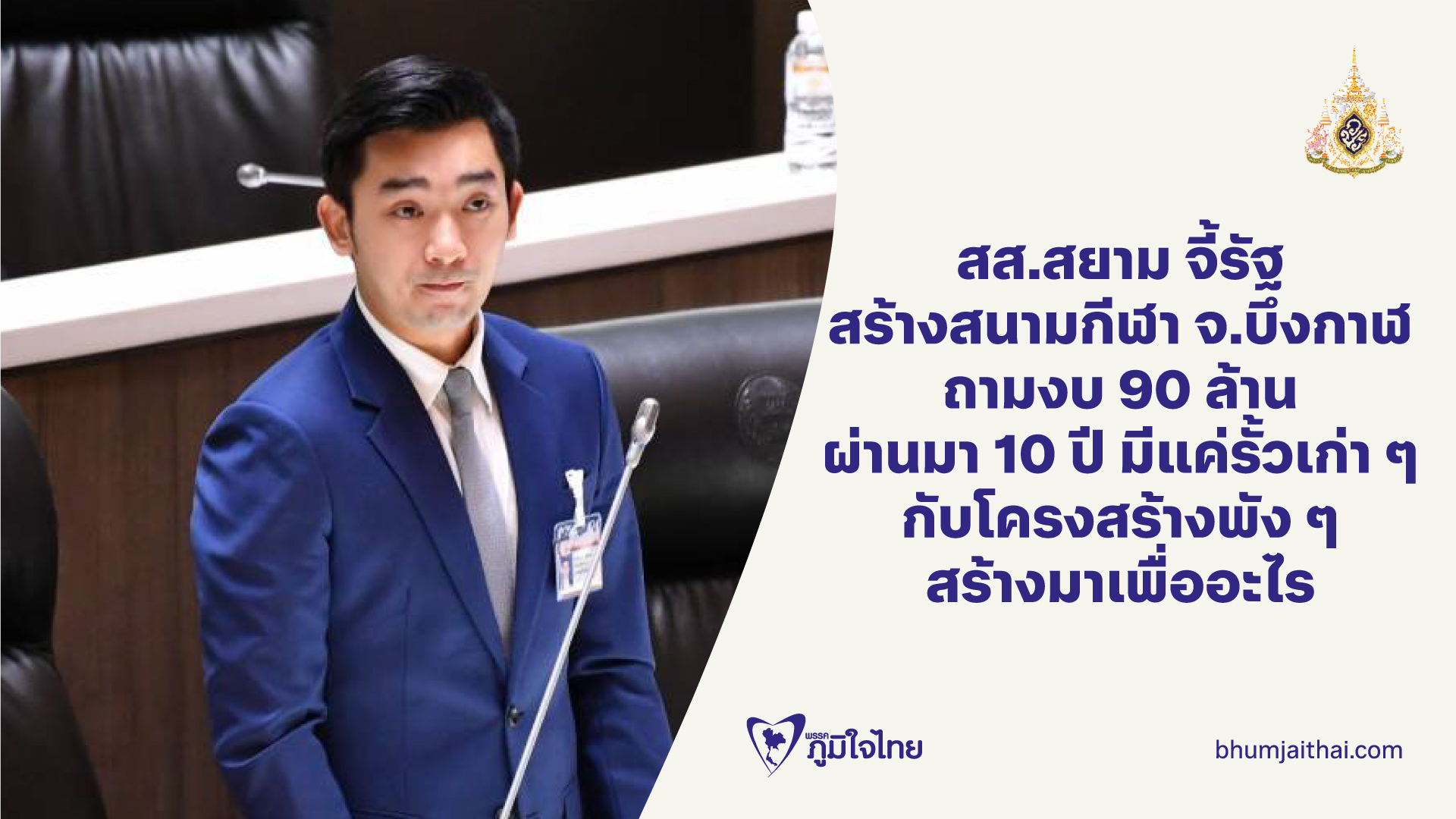 สส.สยาม จี้รัฐสร้างสนามกีฬา จ.บึงกาฬ ถามงบ 90 ล้าน ผ่านมา 10 ปี มีแค่รั้วเก่า ๆ กับโครงสร้างพัง ๆ สร้างมาเพื่ออะไร