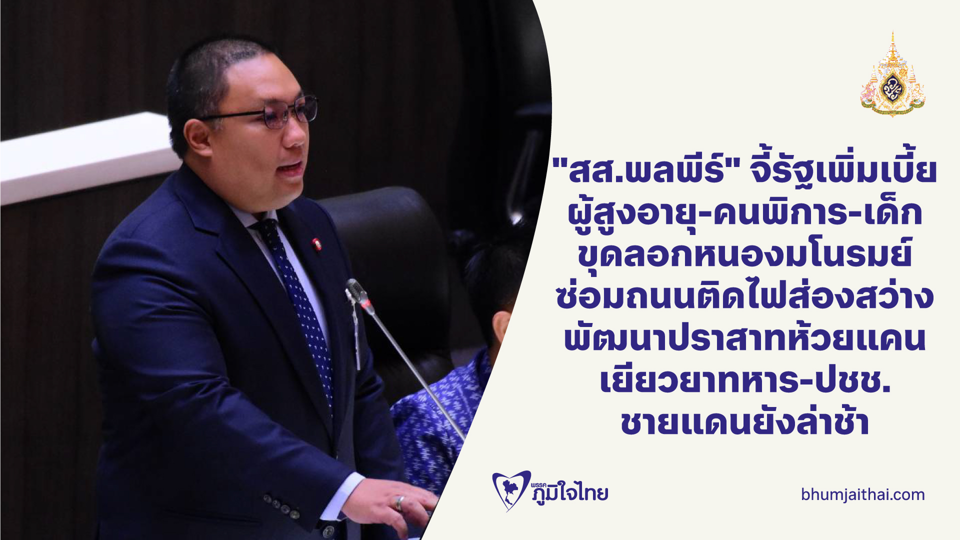 "สส.พลพีร์" จี้รัฐเพิ่มเบี้ย ผู้สูงอายุ-คนพิการ-เด็ก ขุดลอกหนองมโนรมย์ ซ่อมถนนติดไฟส่องสว่าง พัฒนาปราสาทห้วยแคน เยียวยาทหาร-ปชช. ชายแดนยังล่าช้า