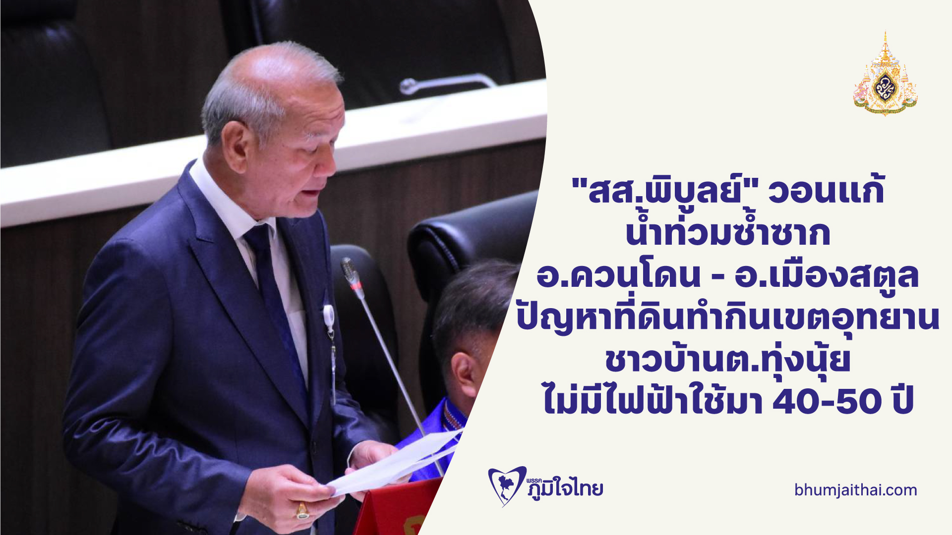 "สส.พิบูลย์" วอนแก้น้ำท่วมซ้ำซาก อ.ควนโดน และ อ.เมืองสตูล -ปัญหาที่ดินทำกินในเขตอุทยาน -ชาวบ้านต.ทุ่งนุ้ย ไม่มีไฟฟ้าใช้มา 40-50 ปี