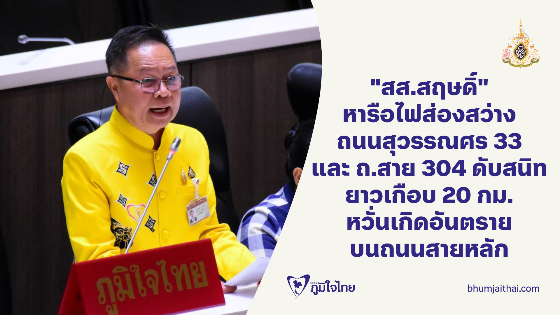 "สส.สฤษดิ์" หารือสภา ไฟส่องสว่างถนนสุวรรณศร 33 และถนนสาย 304 ดับสนิทยาวเกือบ 20 กม. หวั่นเกิดอันตราย บนถนนสายหลัก