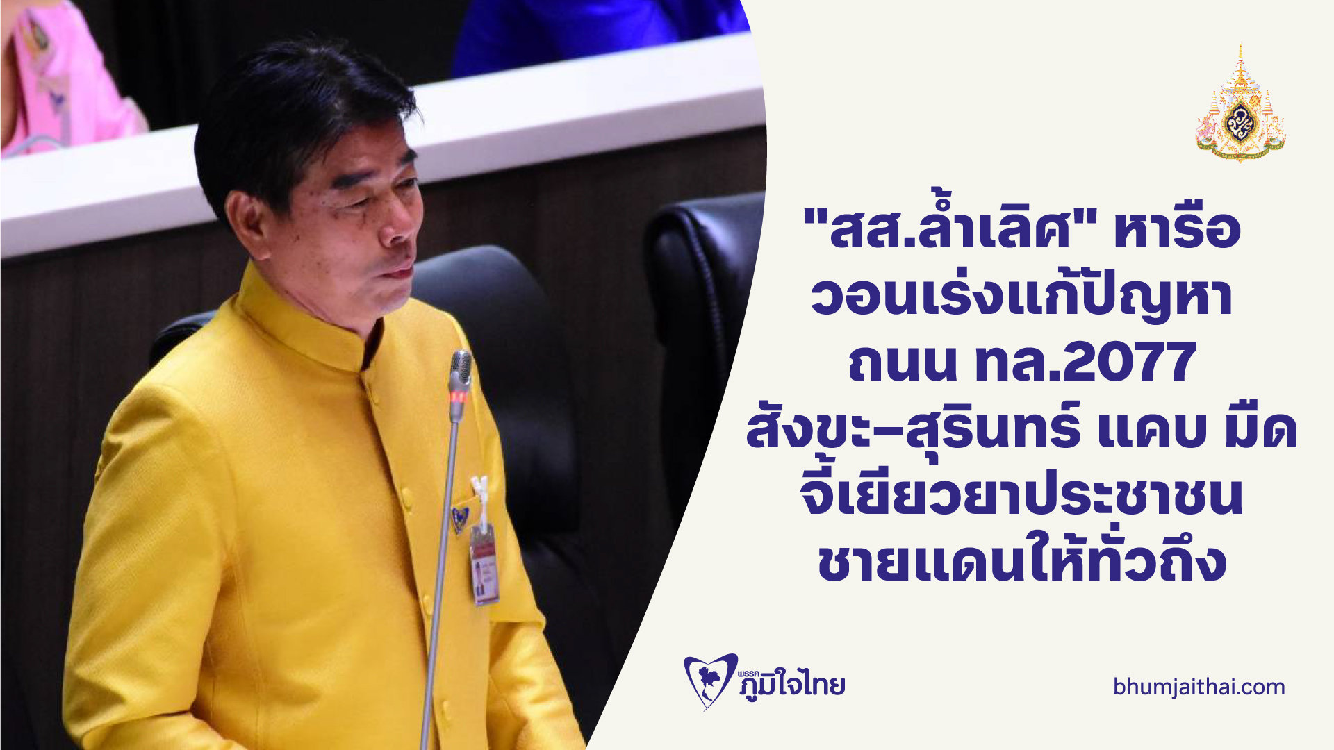 "สส.ล้ำเลิศ" หารือสภาฯ วอนเร่งแก้ปัญหาถนน ทล.2077 สังขะ–สุรินทร์ แคบ มืด เกิดอุบัติเหตุบ่อยครั้ง พร้อมจี้เยียวยาประชาชนชายแดนให้ทั่วถึง โดยเฉพาะในพื้นที่สีแดง