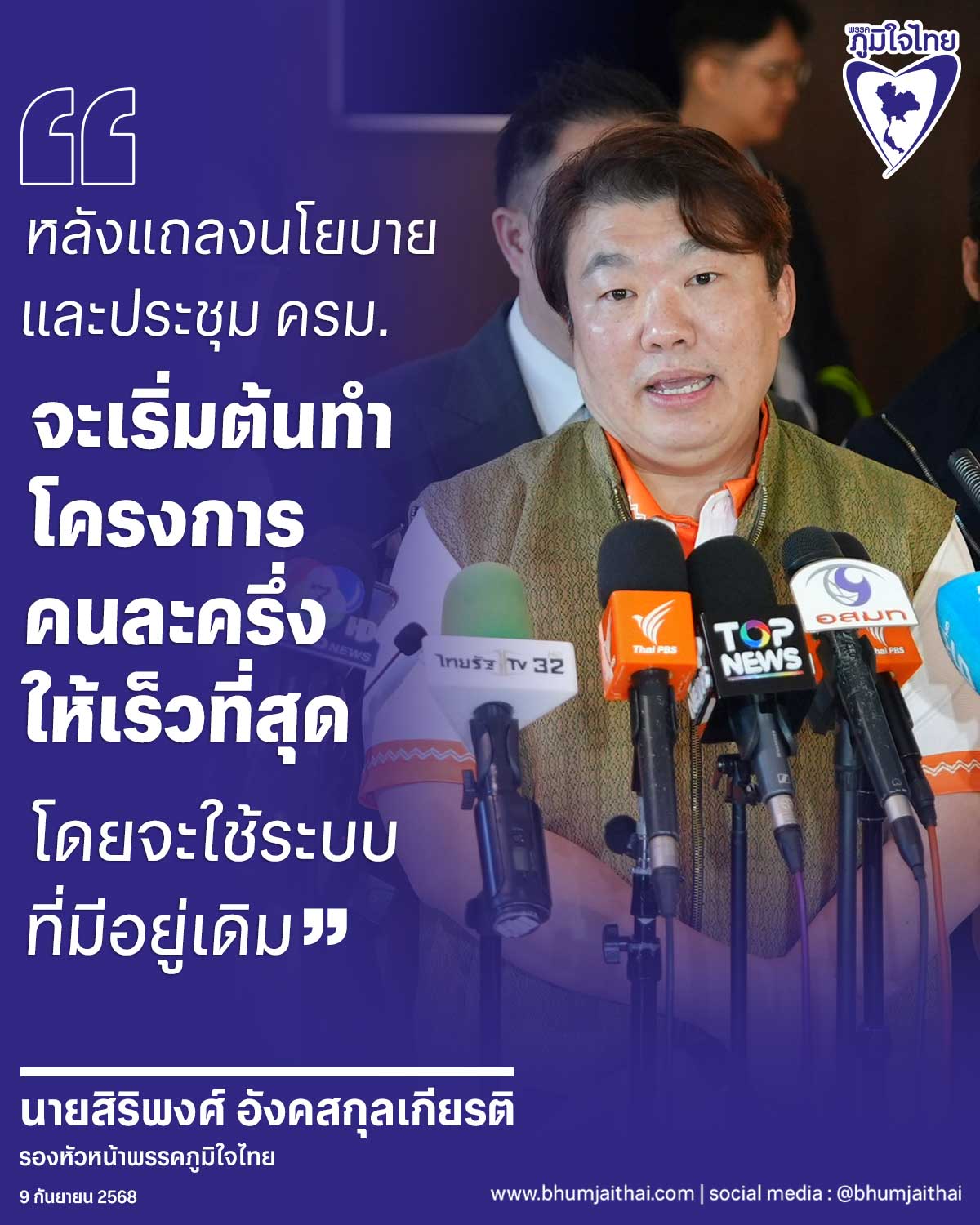 วันที่ 9 ก.ย.68 นายสิริพงศ์ อังคสกุลเกียรติ รองหัวหน้าพรรคภูมิใจไทย กล่าวภายหลังสมาคมภัตตาคาร ร้านอาหารแห่งประเทศไทย และผู้บริหารแพลตฟอร์มเดลิเวอรี่ในไทย อาทิ LINE MAN Wongnai Grab เข้าพบคณะทำงานพรรคภูมิใจไทย เกี่ยวกับโครงการคนละครึ่ง ว่า ภาคเอกชนแสดงความพร้อมที่จะสนับสนุนโครงการ โดยยินดีที่จะแชร์ข้อมูลร้านอาหาร ให้กับกระทรวงการคลัง เพื่อจัดทำฐานข้อมูล ซึ่งจะช่วยให้ผู้ที่เคยใช้โครงการจากแพลตฟอร์มเดิม ไม่ต้องลงทะเบียนใหม่