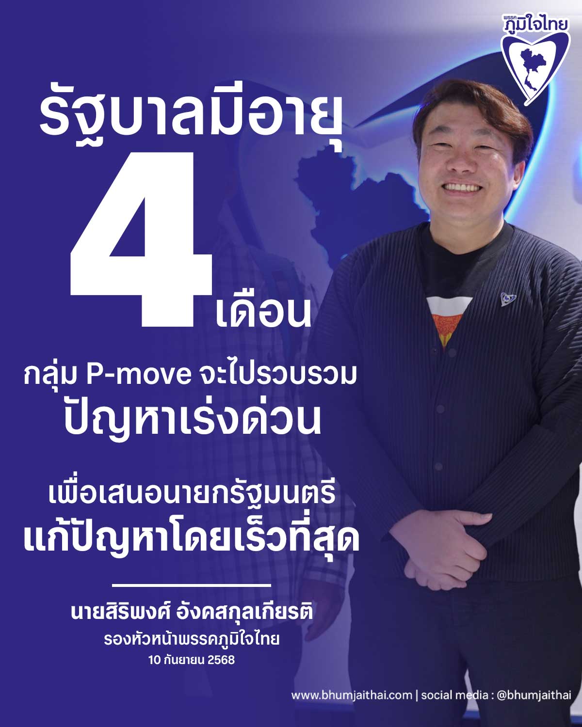 วันที่ 10 ก.ย.2568 นายสิริพงศ์ อังคสกุลเกียรติ รองหัวหน้าพรรคภูมิใจไทย ต้อนรับกลุ่มขบวนการประชาชนเพื่อสังคมที่เป็นธรรม หรือ พีมูฟ นำโดยนายธีรเนตร ไชยสุวรรณ ประธานกรรมการบริหารพีมูฟ ที่มาเสนอนโยบายภาคประชาชน 10 ด้านประกอบด้วย สิทธิเสรีภาพและประชาธิปไตย การกระจายอำนาจ การปฏิรูปกระบวนการยุติธรรม ที่ดินและการคุ้มครองพื้นที่เกษตรกรรม การจัดการทรัพยากรธรรมชาติและสิ่งแวดล้อม การป้องกันภัยพิบัติ การคุ้มครองชาติพันธุ์และสิทธิความเป็นมนุษย์ สิทธิและสถานะบุคคล รัฐสวัสดิการ และที่อยู่อาศัย ที่เคยเสนอไว้กับรัฐบาลชุดที่ผ่านมา และมีมติครม.รองรับไปใช้ในการบริหารราชการแผ่นดิน รวมทั้งขอให้ประสานงานไปยังหน่วยงานและคณะทำงานที่สามารถดำเนินการแก้ปัญหาได้ต่อเนื่อง และขอให้มีกลไกคณะทำงานในการติดตามการแก้ไขปัญหาของขบวนการประชาชนเพื่อสังคมที่เป็นธรรมและประชาชน โดยมีรองนายกรัฐมนตรี ที่นายกรัฐมนตรีแต่งตั้งเป็นประธาน