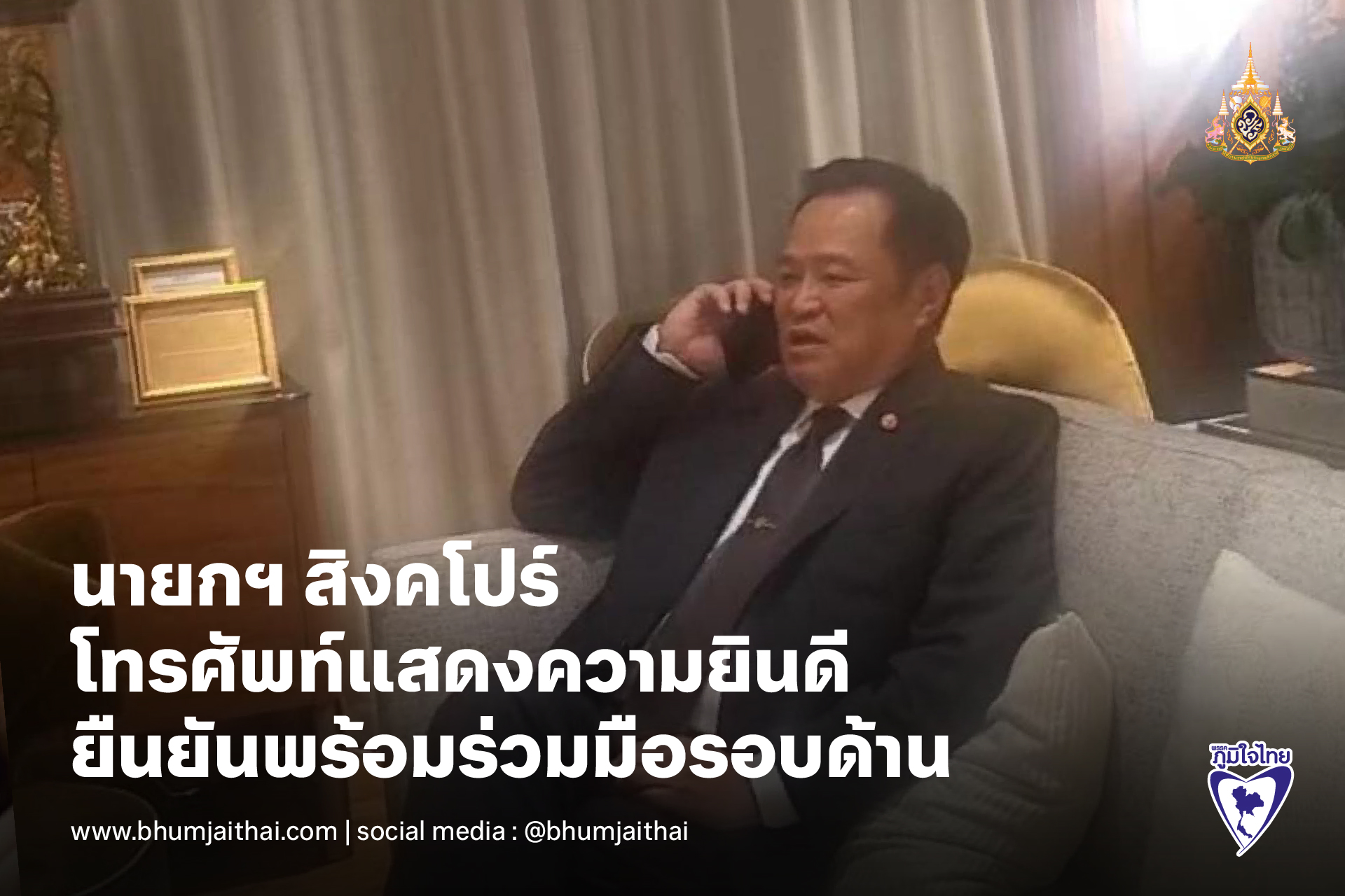 นายกฯ สิงคโปร์ โทรศัพท์แสดงความยินดี “อนุทิน” รับตำแหน่งนายกรัฐมนตรีไทย ยืนยันพร้อมร่วมมือรอบด้าน