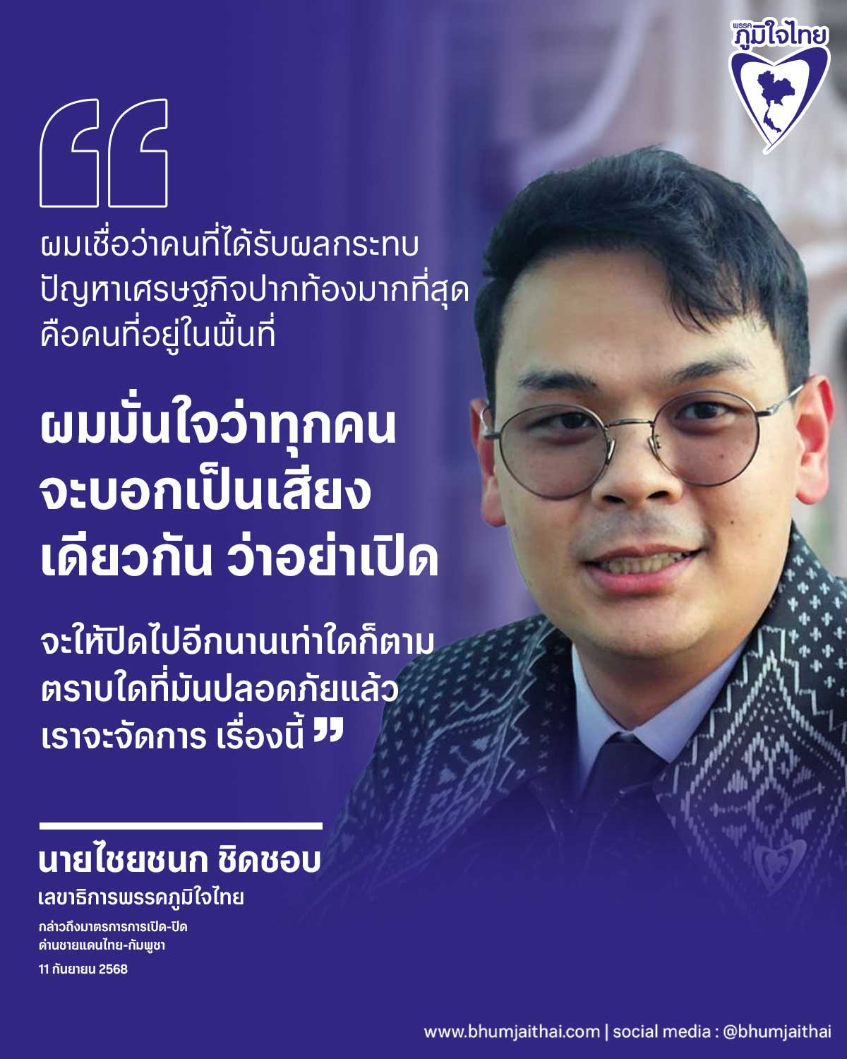 นายไชยชนก ชิดชอบ สส.บุรีรัมย์ และเลขาธิการพรรคภูมิใจไทย กล่าวถึงกรณีข้อตกลงของคณะกรรมการชายแดนทั่วไป (GBC) ระหว่างประเทศไทย-กัมพูชา ในการพิจารณาเปิดด่านชายแดน ไทย-กัมพูชาว่า สิ่งที่ไม่อยากให้พี่น้องประชาชนเข้าใจผิดเพราะกระแสออนไลน์ตอนนี้ไปอีกทิศทางหนึ่ง ขณะนี้สถานการณ์ยังไม่นิ่งไม่สงบยังไม่มีความชัดเจน และเรากำลังเดินหน้าพิจารณาเรื่องการยกเลิก MOU 43 และ44 จึงเป็นเวลาไม่เหมาะสมอย่างยิ่งที่จะต้องเปิดด่าน และตามกระแสสังคมที่เห็น อาจมีการตีความผิดพลาด จากการสื่อสารที่ระบุว่านายอนุทิน ชาญวีรกูล นายกรัฐมนตรี มีนโยบายแบบนี้ แต่ส่วนตัว มั่นใจว่านายอนุทินเป็นหนึ่งในคนที่รักชาติและสถาบันมากที่สุด อีกทั้งที่ผ่านมาพรรคภูมิใจไทยไปคลุกคลีในพื้นที่ 4 จังหวัดที่ได้รับผลกระทบจากปัญหาชายแดนไทย-กัมพูชา ในการลงไปดูแลพี่น้องประชาชนที่ศูนย์อพยพ นำคนออกจากบ้าน และมีคนคิดสั้น จึงเชื่อว่าเป็นการสื่อสารที่ผิด เข้าใจผิดว่าเป็นนโยบายของนายอนุทิน ทั้งนี้เห็นว่าไม่เหมาะสมน่าจะเป็นภัยต่อประเทศ