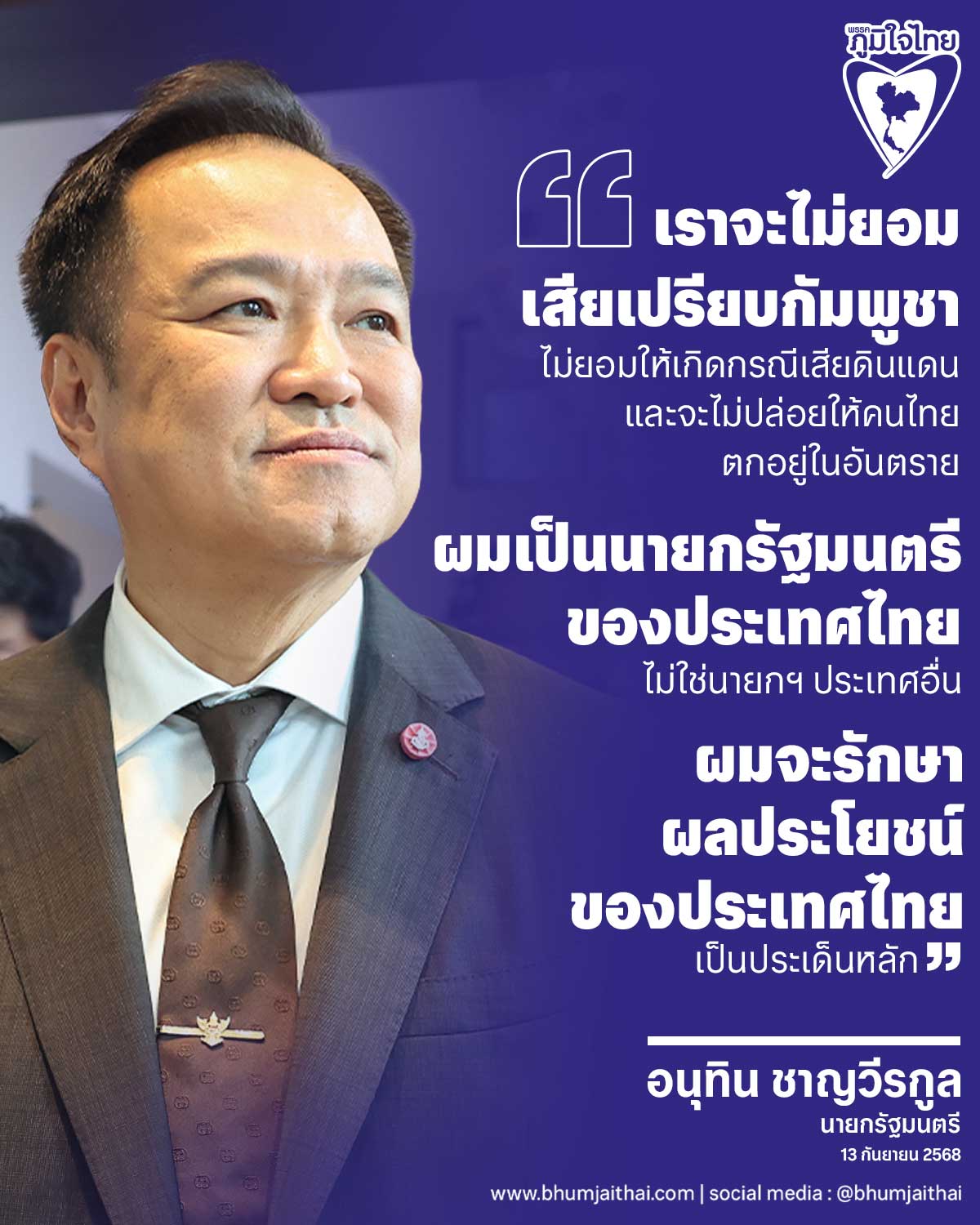 “เรื่องชายแดน ผมยืนยันชัดเจนว่าเราจะไม่ยอมเสียเปรียบกัมพูชา ไม่ยอมให้เกิดกรณีเสียดินแดน และจะไม่ปล่อยให้คนไทยตกอยู่ในอันตราย ผมเป็นนายกรัฐมนตรีของประเทศไทย ไม่ใช่นายกฯ ประเทศอื่น ดังนั้น ผมจะรักษาผลประโยชน์ของประเทศไทยเป็นประเด็นหลัก” นายอนุทิน กล่าว