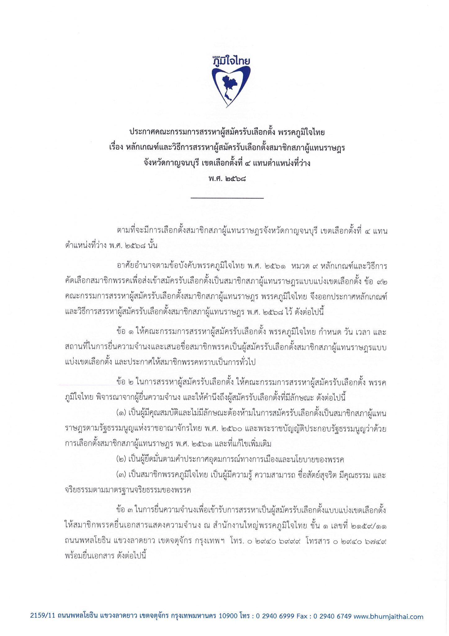 13 กันยายน 2568 เวลา 17:00ประกาศคณะกรรมการสรรหาผู้สมัครรับเลือกตั้ง พรรคภูมิใจไทย เรื่อง หลักเกณฑ์และวิธีการสรรหาผู้สมัครรับเลือกตั้งสมาชิกสภาผู้แทนราษฎร จังหวัดกาญจนบุรี เขตเลือกตั้งที่ ๔ แทนตำแหน่งที่ว่าง พ.ศ. ๒๕๖๘ แชร์บทความนี้: