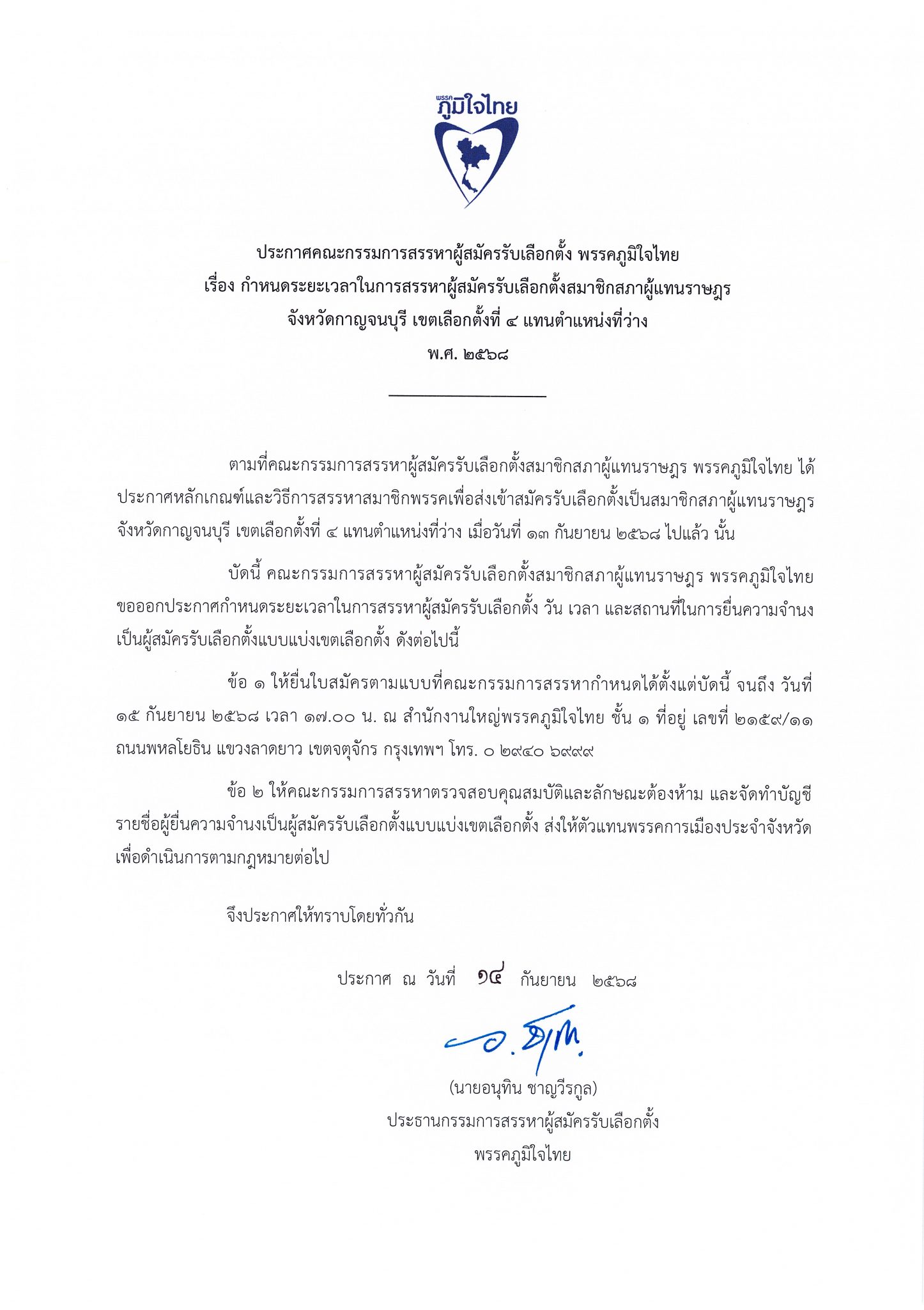 14 กันยายน 2568 เวลา 11:00ประกาศคณะกรรมการสรรหาผู้สมัครรับเลือกตั้ง พรรคภูมิใจไทย เรื่อง กำหนดระยะเวลาในการสรรหาผู้สมัครรับเลือกตั้งสมาชิกสภาผู้แทนราษฎร จังหวัดกาญจนบุรี เขตเลือกตั้งที่ ๔ แทนตำแหน่งที่ว่าง พ.ศ. ๒๕๖๘แชร์บทความนี้: