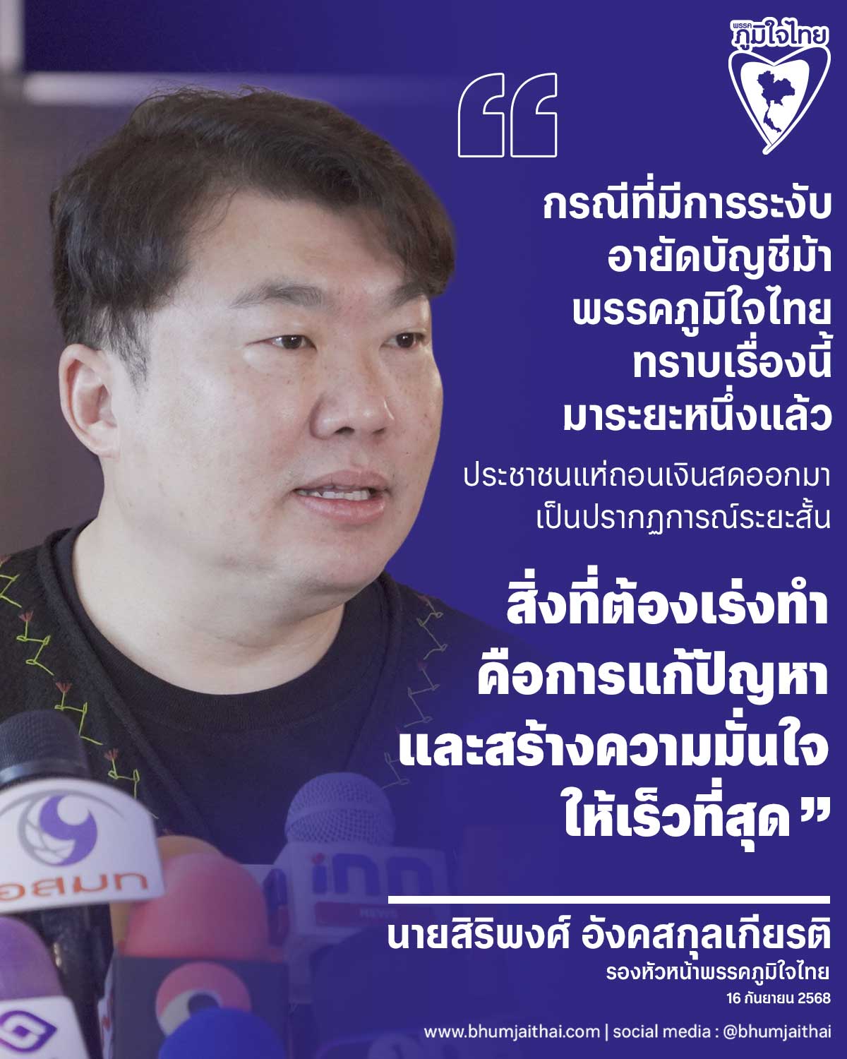 นายสิริพงศ์ กล่าวถึง กรณีที่มีการระงับ อายัดบัญชีม้า ในขณะนี้ ว่า พรรคภูมิใจไทยทราบเรื่องนี้มาระยะหนึ่งแล้ว ซึ่งผู้ที่ได้รับผลกระทบไม่ได้อยู่ในวงกว้าง อาจจะมีบางกลุ่มที่มีการเทรดบิทคอยน์หรือเงินดิจิทัล และได้รับเงินโอนเข้ามาผ่านแอปพลิเคชันต่างประเทศ จึงถูกระงับบัญชีครั้งละ 3 เดือน รวมถึงผู้ที่ได้รับการโอนเงินจากบัญชีม้าจริงๆ อีกทั้งบางรายก็ถึงขั้นล้มละลายถูกปิดทุกช่องทางการเงินไม่สามารถกู้ยืมได้