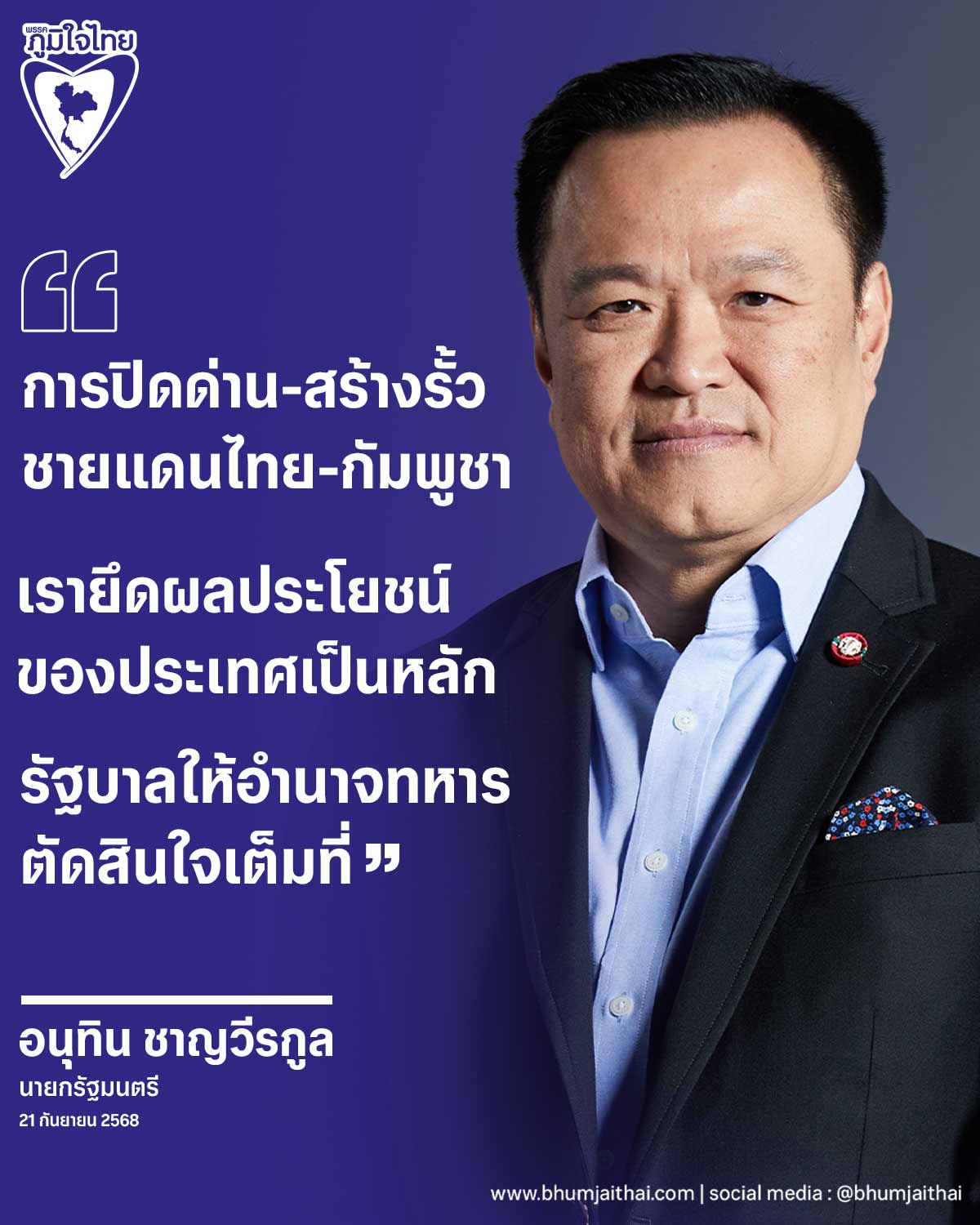 วันที่ 21 กันยายน 2568 นายอนุทิน ชาญวีรกูล นายกรัฐมนตรี ให้สัมภาษณ์ถึงประเด็นการเปิดด่านชายแดนไทย–กัมพูชาและการสร้างรั้วตามแนวชายแดนว่า รัฐบาลจะให้การสนับสนุนกองทัพอย่างเต็มที่ในการดูแลความมั่นคง โดยให้อำนาจทหารตัดสินใจอย่างเต็มที่ ขณะเดียวกันจะใช้การทูตและการเจรจาระดับรัฐต่อรัฐเพื่อให้กัมพูชายอมรับเงื่อนไขของไทย