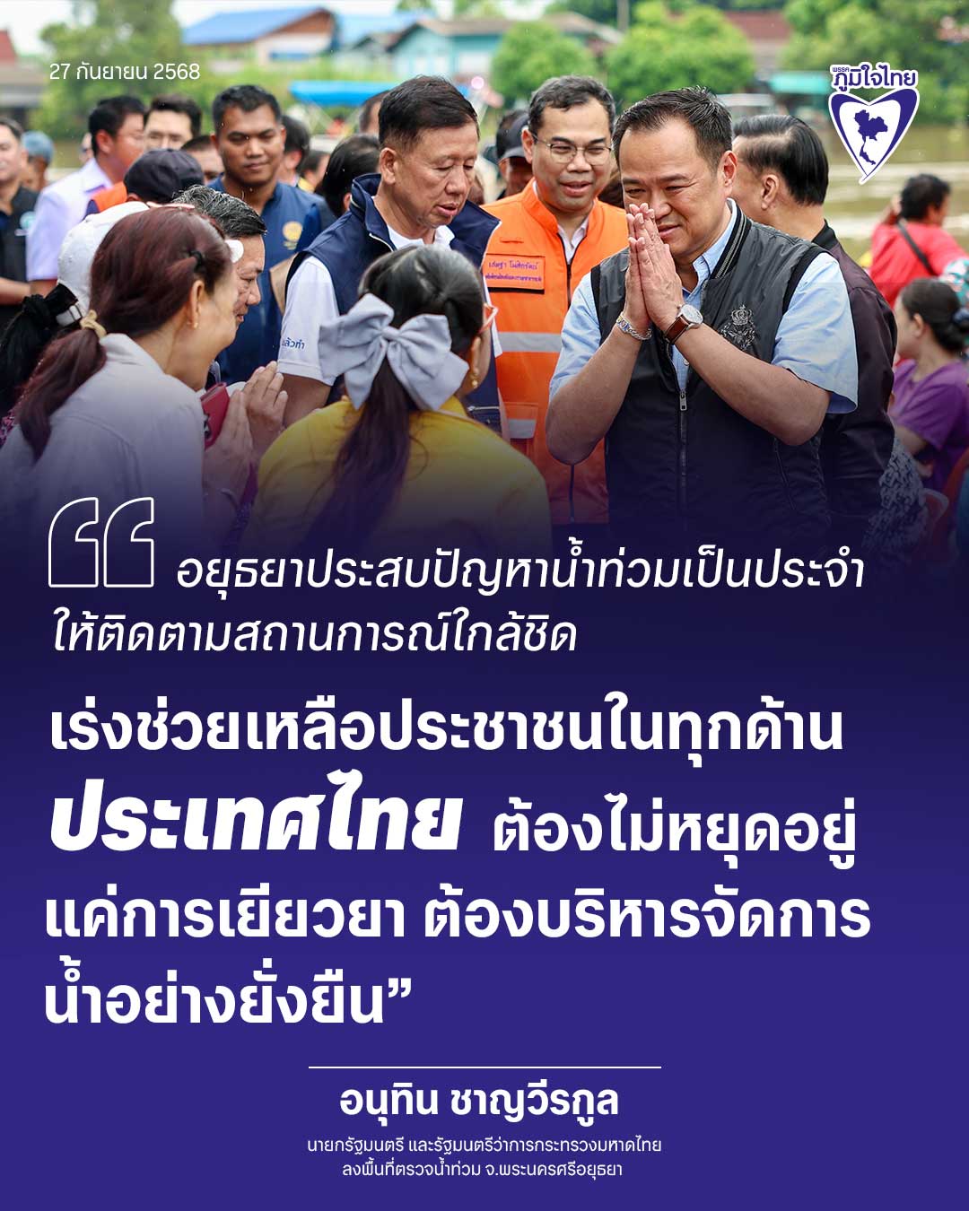 วันที่ 27 กันยายน 2568 นายอนุทิน ชาญวีรกูล นายกรัฐมนตรีและรัฐมนตรีว่าการกระทรวงมหาดไทย ลงพื้นที่จังหวัดพระนครศรีอยุธยา เพื่อติดตามสถานการณ์อุทกภัย พร้อมคณะรัฐมนตรี ที่เกี่ยวข้อง รวมถึงผู้ว่าราชการจังหวัด พระนครศรีอยุธยา นายอำเภอ และผู้บริหารองค์กรปกครองส่วนท้องถิ่น