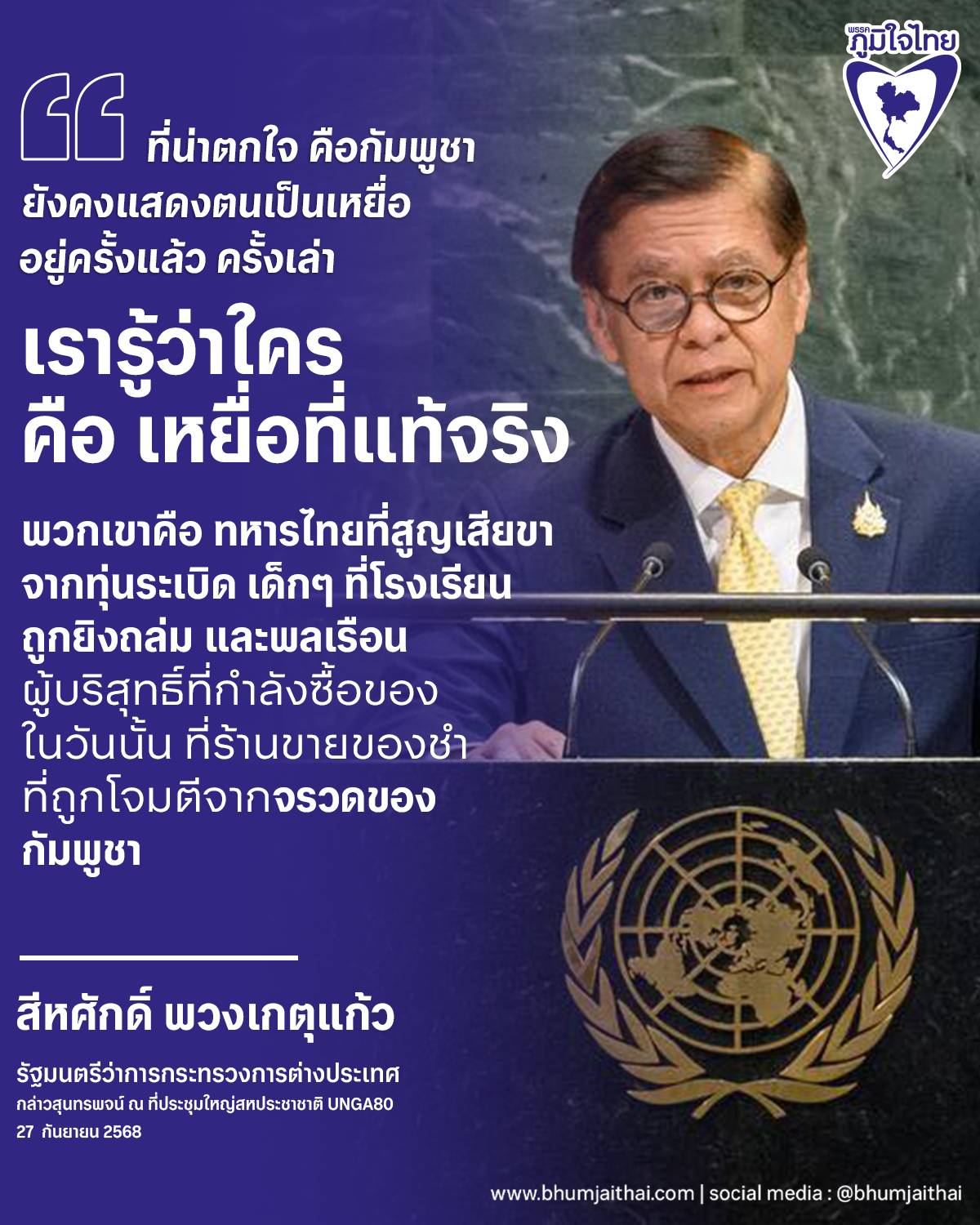 28 กันยายน 2568 นายสีหศักดิ์ พวงเกตุแก้ว รัฐมนตรีว่าการกระทรวงการต่างประเทศ ขึ้นกล่าวสุนทรพจน์ในการอภิปรายทั่วไปของการประชุมสมัชชาใหญ่แห่งสหประชาชาติ สมัยสามัญ ครั้งที่ 80 ณ สำนักงานใหญ่สหประชาชาติ นครนิวยอร์ก วานนี้ (27 กันยายน) โดยชี้แจงข้อเท็จจริงกรณีกัมพูชาพยายามบิดเบือนและแสดงตนเป็นเหยื่อในข้อพิพาทพรมแดนที่เกิดขึ้น โดยมีจุดมุ่งหมายเพื่อขยายข้อพิพาทไปสู่ระดับนานาชาติ