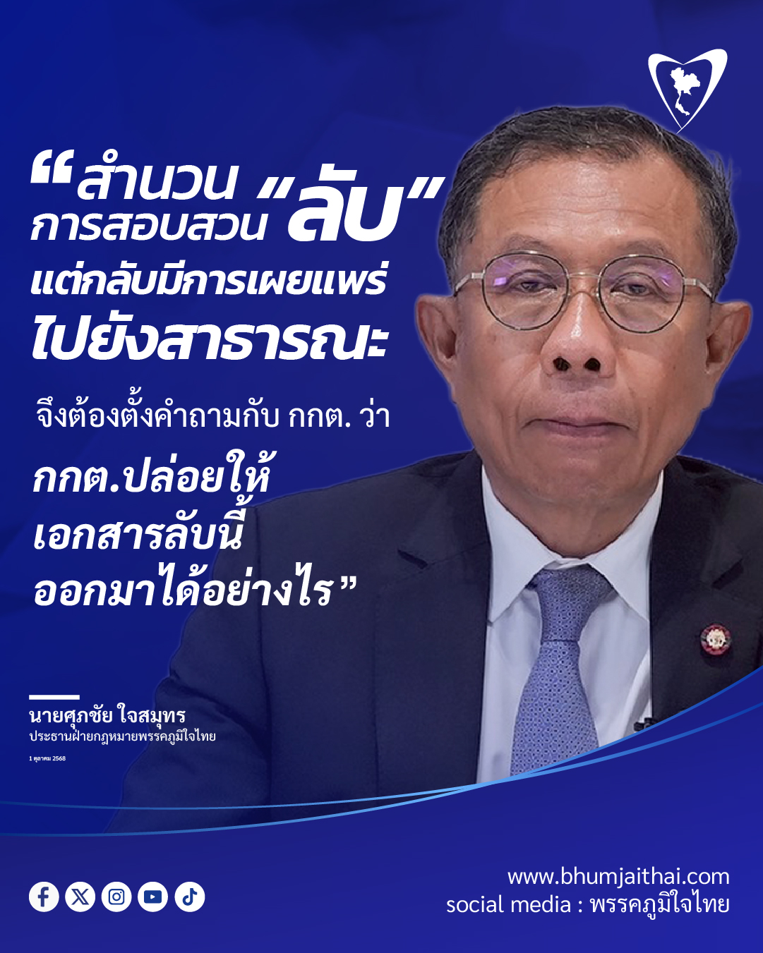 วันที่ 1 ตุลาคม 2568 นายศุภชัย ใจสมุทร ประธานฝ่ายกฎหมายพรรคภูมิใจไทย แถลงถึง เรื่องการปฏิบัติหน้าที่ของพนักงานสอบสวน คณะอนุกรรมการที่ 26 ซึ่งมีหน้าที่ในการสืบสวนสอบ ในคดีเกี่ยวกับเรื่องการเลือกตั้งสมาชิกวุฒิสภาหรือ คดีฮั้ว สว. ซึ่งจากการอภิปรายแถลงนโยบายของรัฐบาล (29-30 กันยายน 68) สมาชิกสภาผู้แทนราษฎรและบุคคลภายนอก รวมถึงสื่อมวลชน ได้มีเอกสารซึ่งอยู่ในความครอบครองดังกล่าว ซึ่งเป็นเอกสารราชการลับทางราชการของคณะอนุกรรมการชุดที่ 26 ที่สอบสวนคดีนี้ ได้ไปปรากฏเป็นรายละเอียดให้กับผู้อภิปราย และสื่อมวลชน ไม่ว่าจะเป็นเอกสารที่ระบุว่า ผู้ถูกกล่าวหาในคดีนี้มีใครบ้าง ลําดับที่เท่าไหร่ ซึ่งเรื่องนี้ควรจะเป็นสํานวนการสอบสวนที่เป็นความลับของทางราชการ รวมถึงมีบันทึกแจ้งข้อกล่าวหา แต่มีรายละเอียดปรากฏไปยังบุคคลอื่น และปรากฏกับสื่อมวลชน นั้น จึงทำให้เกิดข้อสงสัย และขอตั้งคําถามกับคณะกรรมการการเลือกตั้ง (กกต.) ว่า กรณีดังกล่าวเกิดขึ้นได้อย่างไร ในเมื่อเอกสารทั้งหลายในสํานวน การสอบสวน ควรจะเป็นความลับของทางราชการ แต่กลับไปปรากฏสู่สาธารณะ