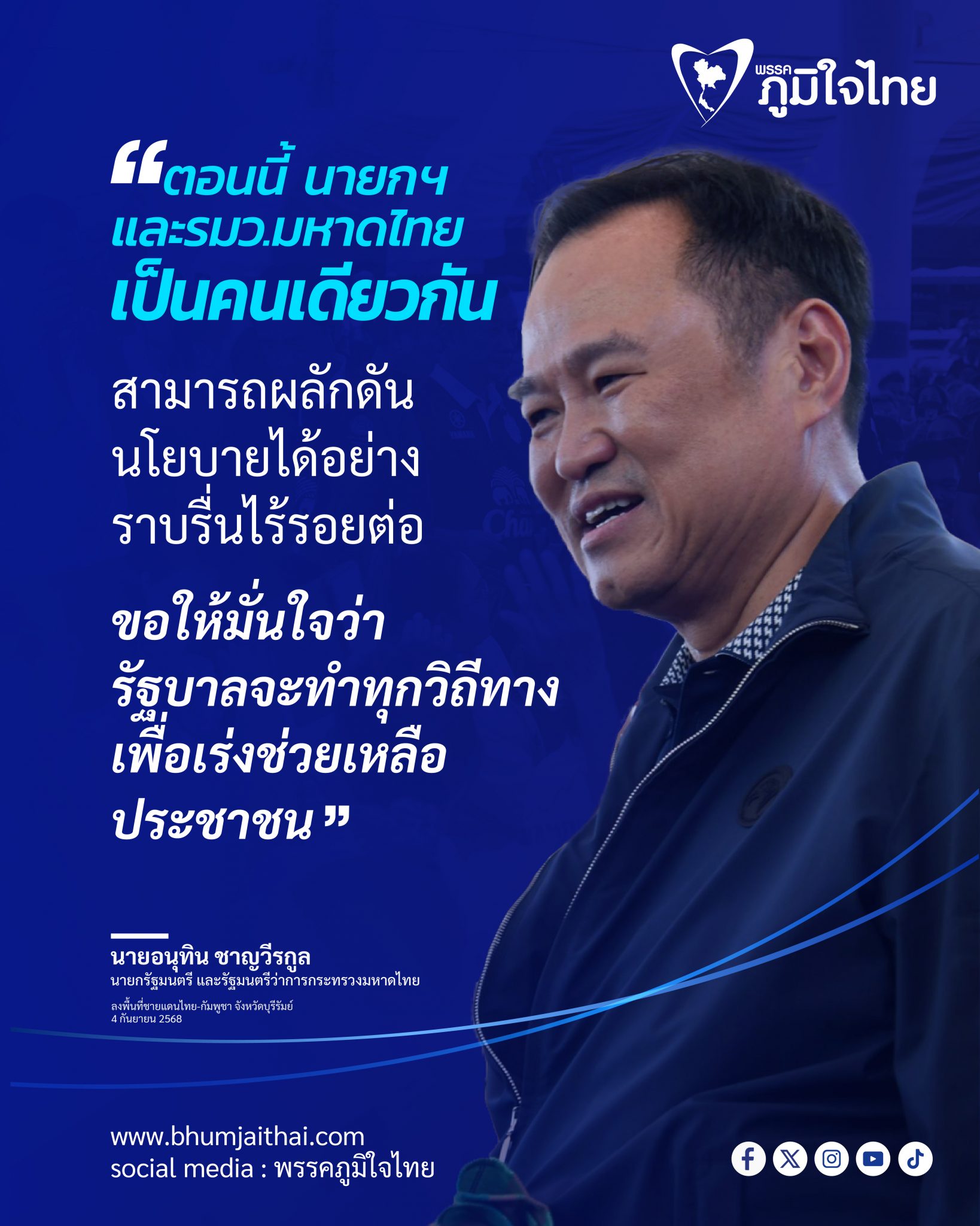 ตอนนี้นายกรัฐมนตรีและรัฐมนตรีว่าการกระทรวงมหาดไทยเป็นคนคนเดียวกันจึงสามารถดำเนินนโยบายต่างๆได้อย่างราบรื่นไร้รอยต่อขอให้พี่น้องประชาชนมั่นใจว่ารัฐบาลจะทำทุกวิถีทางเพื่อเร่งช่วยเหลือพี่น้องประชาชน