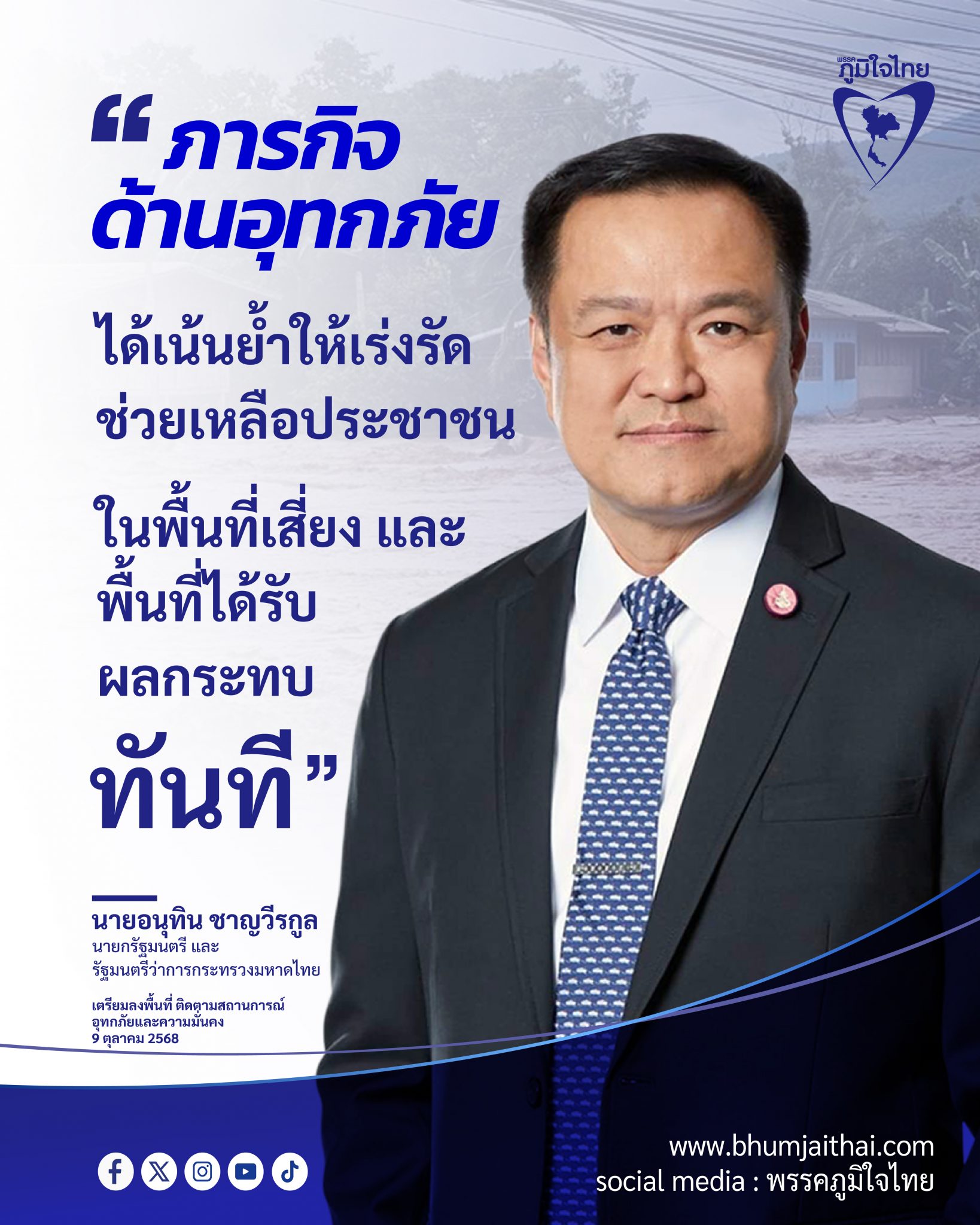“อนุทิน” เตรียมลงพื้นที่ต่อเนื่อง—ศุกร์ตรวจน้ำท่วมภาคกลางตอนบน เสาร์ลงใต้ถกความมั่นคง แก้ปัญหาเหตุไม่สงบ