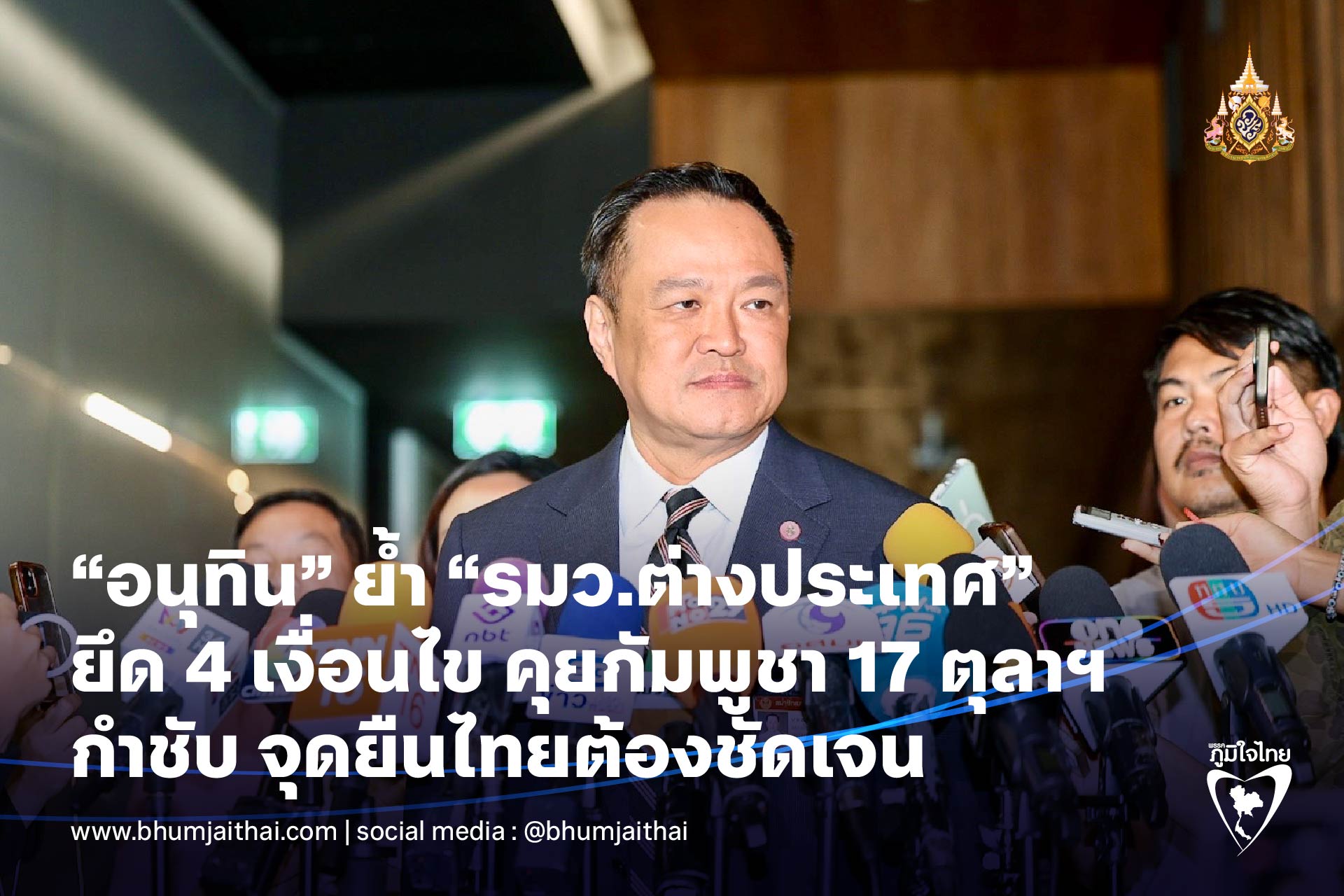 “อนุทิน” ย้ำ “รมว.ต่างประเทศ” ยึด 4 เงื่อนไข คุยกัมพูชา 17 ตุลาฯ กำชับ จุดยืนไทย ต้องชัดเจน