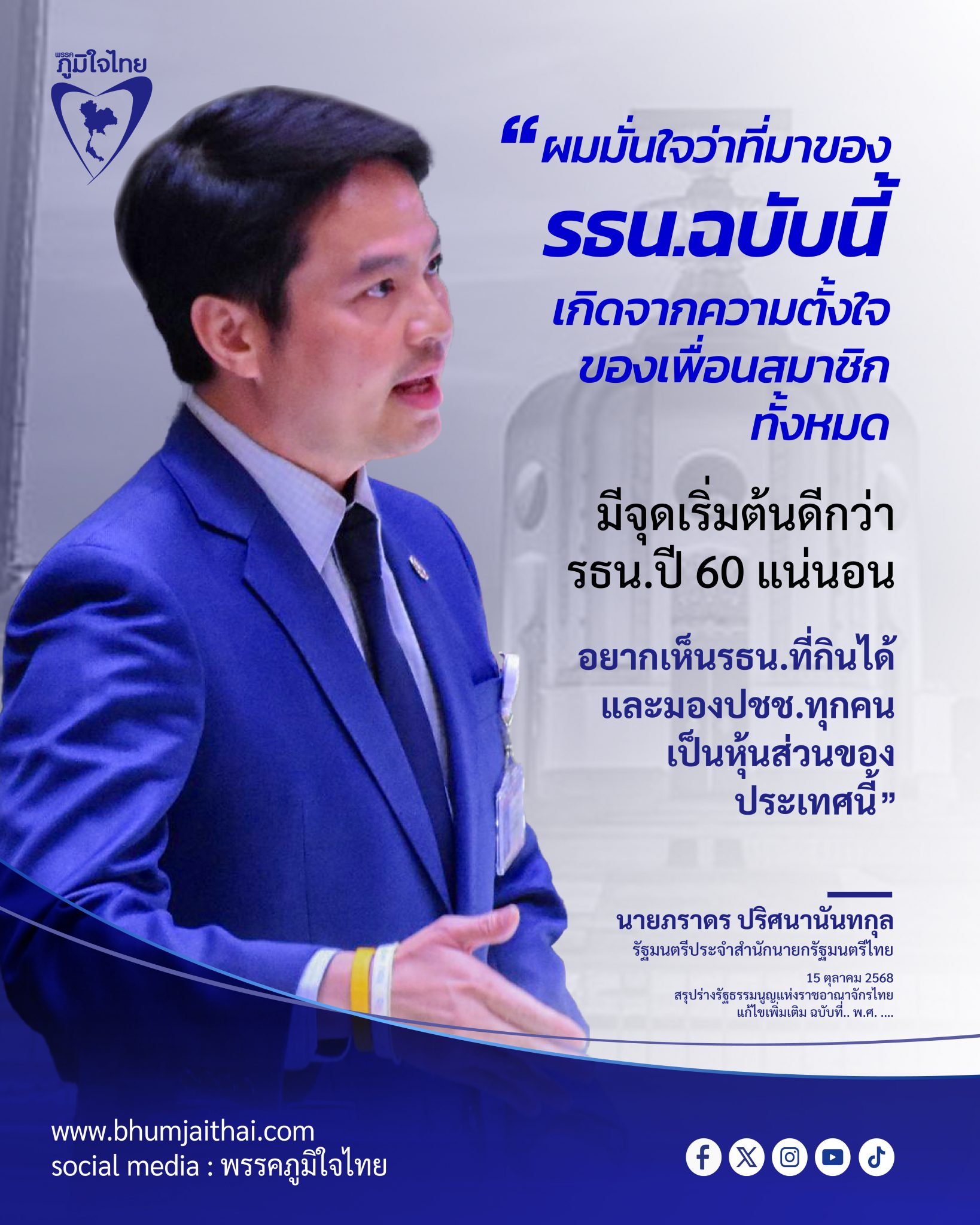 วันที่ 15 ตุลาคม 2568 ที่รัฐสภา ในการประชุมร่วมกันของรัฐสภา ที่มีนายวันมูหะมัดนอร์ มะทา ประธานรัฐสภา ทำหน้าที่ประธานการประชุม เพื่อพิจารณาร่างรัฐธรรมนูญแห่งราชอาณาจักรไทย (แก้ไขเพิ่มเติม) ฉบับที่.. พ.ศ. .… 3 ฉบับ ได้แก่ฉบับของพรรคประชาชน พรรคภูมิใจไทย และพรรคเพื่อไทย เพื่อแก้ไขเพิ่มเติม มาตรา 256 เพิ่มหมวด 15/1 การจัดทำรัฐธรรมนูญฉบับใหม่ เป็นวันที่ 2 ก่อนที่จะมีการลงมติในวาระรับหลักการ นายภราดร ปริศนานันทกุล รมต.ประจำสำนักนายกรัฐมนตรี และสส.อ่างทอง พรรคภูมิใจไทย กล่าวสรุปอภิปรายว่า เชื่อว่าการลงมติในครั้งนี้จะเป็นโอกาสสำคัญเดินหน้าสู่การสถาปนาแก้รัฐธรรมนูญฉบับใหม่ โดยความสำเร็จจะเกิดขึ้นได้ถ้าทุกคนร่วมมือกันอย่างจริงจัง และจริงใจอย่างถึงที่สุด ซึ่งอุปสรรคใหญ่สำหรับการแก้รัฐธรรมนูญคือ การที่กรรมาธิการมีเวลา 40 วัน ในการพิจารณาความเห็นไม่ตรงกันของทั้ง 3 ร่าง ถ้าหากไม่เกิดฉันทามติ ไม่เกิดการตกลงร่วมกัน ไม่เกิดความรอมชอม ก็จะไม่มีทางสำเร็จด้วยเวลาที่สั้น ตลอดจนความเห็นต่างในร่างของพรรคเพื่อไทย พรรคประชาชน ที่ไม่ระบุชัดเจนจะไม่แก้ไขหมวด 1 และ 2ในรัฐธรรมนูญ และคำวินิจฉัยศาลรัฐธรรมนูญที่ระบุว่า ห้ามประชาชนเลือกผู้ร่างรัฐธรรมนูญโดยตรง