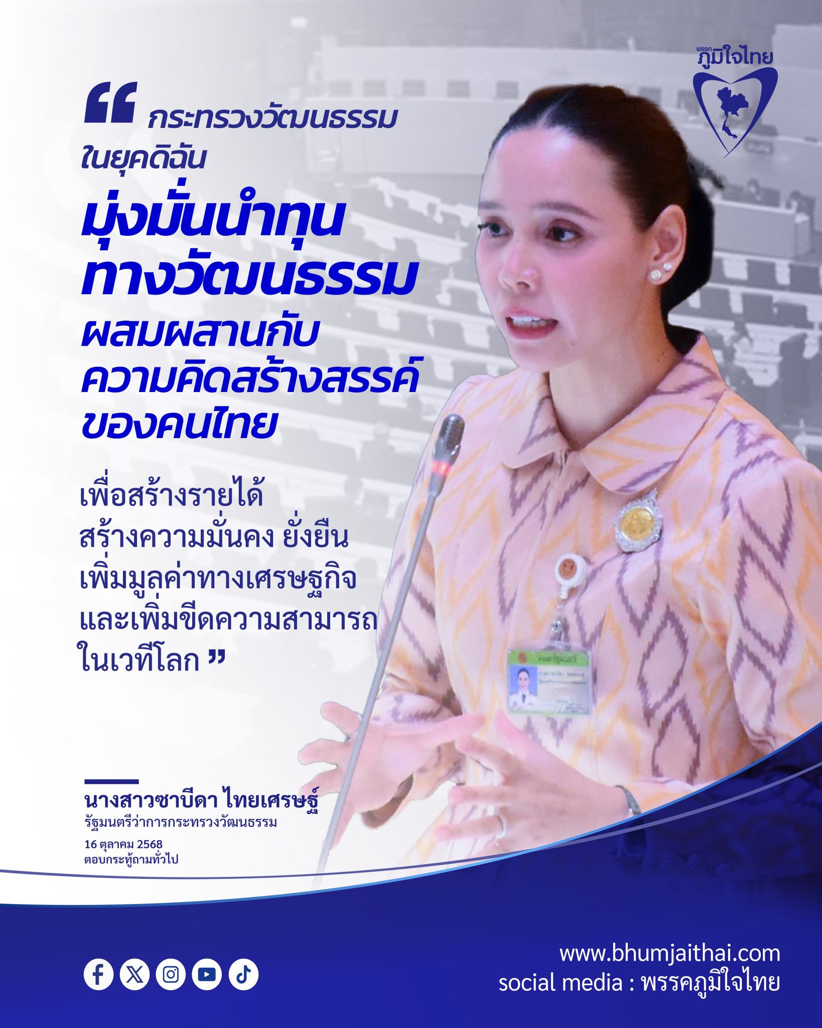 วันที่ 16 ต.ค.2568 ในการประชุมสภาผู้แทนราษฎร นางสาวซาบีดา ไทยเศรษฐ์ รัฐมนตรีว่าการกระทรวงวัฒนธรรม ตอบกระทู้ถามทั่วไปนายอภิสิทธิ์ ไล่สัตรูไกล สส.บัญชีรายช่ื่อ พรรคประชาชน เกี่ยวกับการบริหารงบประมาณ ว่า รัฐมนตรีเพิ่งเข้ารับตำแหน่งได้ประมาณ 2 สัปดาห์ และได้พยายามรีวิวโครงการต่างๆ เพื่อทบทวนและชะลอหลายโครงการที่ไม่มีประสิทธิภาพ โดยจะดูจากผลสัมฤทธิ์ เมื่อเทียบกับปีที่แล้ว ซึ่งจะต้องมีการปรับเปลี่ยนให้เข้ากับนโยบายปัจจุบัน โดยนโยบาย 3 ประการคือ 1.ส่งเสริม การท่องเที่ยวทางวัฒนธรรม 2.คืนเงินทุนให้กับผู้ประกอบการภาพยนตร์ชาวไทย 3.พัฒนาสินค้าทางด้านวัฒนธรรม