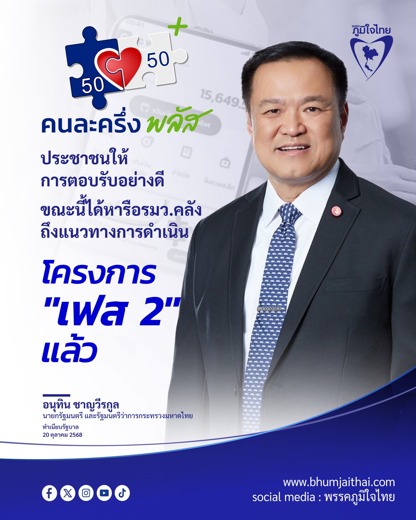 วันที่ 20 ตุลาคม 2568 ที่ทำเนียบรัฐบาล กรุงเทพฯ นายอนุทิน ชาญวีรกูล นายกรัฐมนตรีและรัฐมนตรีว่าการกระทรวงมหาดไทย กล่าวถึงความคืบหน้าโครงการ “คนละครึ่งพลัส” ว่า ขณะนี้ประชาชนให้การตอบรับอย่างดี เดินทางไปลงทะเบียนกันเป็นจำนวนมาก ซึ่งถือเป็นสัญญาณเชิงบวกของเศรษฐกิจไทย