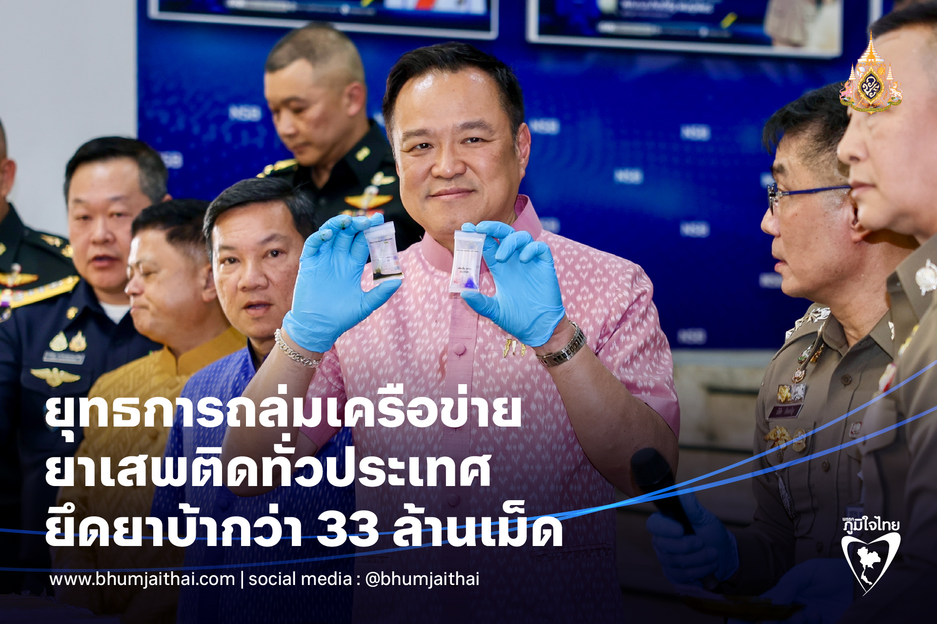 นายอนุทิน ชาญวีรกูล นายกรัฐมนตรีและรัฐมนตรีว่าการกระทรวงมหาดไทย เป็นประธานการแถลงผลปฏิบัติ “ยุทธการทำลายล้างเครือข่ายยาเสพติด ถล่มจุดพัก ทุบคลัง ปิดเส้นลำเลียงทั่วประเทศ” โดยมีนายอรรษิษฐ์ สัมพันธรัตน์ ปลัดกระทรวงมหาดไทย พล.ต.อ.กิตติ์รัฐ พันธุ์เพ็ชร์ ผู้บัญชาการตำรวจแห่งชาติ พ.ต.ต.สุริยา สิงหกมล เลขาธิการ ป.ป.ส. พร้อมด้วยผู้บัญชาการระดับสูงจาก บช.ปส. บช.ตชด. และหน่วยงานความมั่นคงร่วมแถลงข่าว