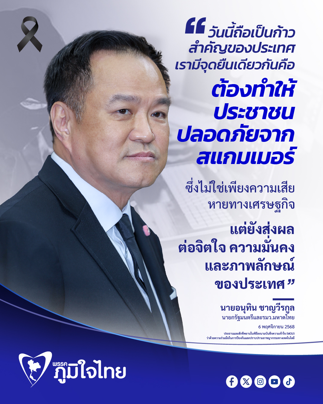 วันที่ 6 พฤศจิกายน 2568 ที่ทำเนียบรัฐบาล — นายอนุทิน ชาญวีรกูล นายกรัฐมนตรีและรัฐมนตรีว่าการกระทรวงมหาดไทย เป็นประธานและสักขีพยานในพิธีลงนามบันทึกความเข้าใจ (MOU) ว่าด้วยความร่วมมือในการป้องกันและปราบปรามอาชญากรรมทางเทคโนโลยี ระหว่าง 15 หน่วยงานภาครัฐและเอกชน อาทิ กระทรวงการคลัง กระทรวงดิจิทัลเพื่อเศรษฐกิจและสังคม กระทรวงยุติธรรม สำนักงานตำรวจแห่งชาติ ธนาคารแห่งประเทศไทย สมาคมธนาคารไทย และสมาคมสถาบันการเงินของรัฐ
