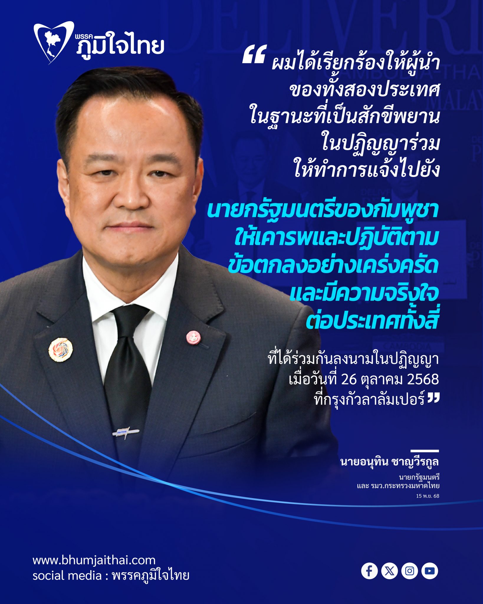 วันนี้ (15 พ.ย. 68) นายอนุทิน ชาญวีรกูล นายกรัฐมนตรี และรัฐมนตรีว่าการกระทรวงมหาดไทย โพสต์ข้อความผ่านเฟซบุ๊กส่วนตัว ระบุว่า “เมื่อคืนนี้ผมได้รับโทรศัพท์จากนายกรัฐมนตรีอันวาร์ อิบราฮิมแห่งมาเลเซีย และประธานาธิบดีสหรัฐ นายโดนัลด์ ทรั้มป์ ซึ่งทั้งสองท่านได้พูดคุยหารือกับผมเกี่ยวกับสถานการณ์ความขัดแย้งระหว่างไทยและกัมพูชา พร้อมทั้งขอให้รัฐบาลไทยยังคงดำรงเป้าหมายการสร้างสันติภาพตามแนวทางที่ได้ลงนามในปฎิญญาที่กรุงกัวลาลัมเปอร์ต่อไป และผมก็ได้แสดงจุดยืนของรัฐบาลไทยซึ่งพอสรุปใจความสำคัญได้ดังนี้