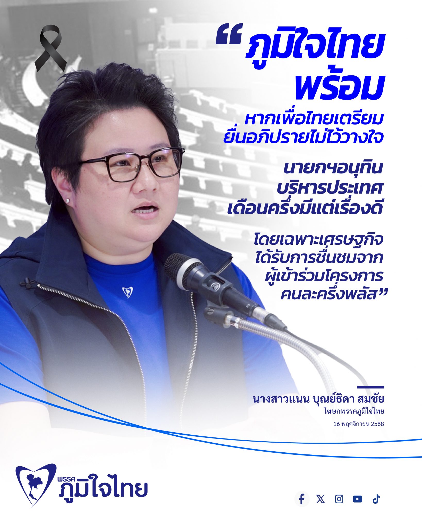 วันที่ 16 พฤศจิกายน 2568 ที่ทำการพรรคภูมิใจไทย นางสาวแนน บุณย์ธิดา สมชัย โฆษกพรรคภูมิใจไทย ให้สัมภาษณ์ถึงกรณีที่พรรคเพื่อไทยออกมารุมกล่าวหา นายอนุทิน ชาญวีรกูล นายกรัฐมนตรีและรัฐมนตรีว่าการกระทรวงมหาดไทย เรื่องภาษีสหรัฐว่า บริหารสถานการณ์บ้านเมืองผิดพลาด ไร้เดียงสา ว่า ช่วงนี้ใช้คำค่อนข้างแรงกับการทำงานนายกรัฐมนตรี ซึ่งนายกฯ ทำงานมาหนึ่งเดือนครึ่ง เวลาที่ผ่านมาผลงานที่ท่านรับปาก ก็ออกดอกออกผล ไม่ว่าจะเรื่องสแกมเมอร์ การแก้ไขปัญหาเศรษฐกิจเบื้องต้น ประเด็นที่เกิดขึ้นในช่วง 2-3 วันนี้ ”อยากจะบอกฝ่ายแค้นว่า ใจเย็น ๆ ให้ทำหน้าที่ตรวจสอบแบบฝ่ายค้านแต่ไม่ใช่แบบฝ่ายแค้น“ ให้ดูดีๆ ว่าสิ่งที่นายกฯ พยายามจะสื่อและทำอยู่ อย่างแรก คือ อธิปไตยของชาติ ประเทศไทย คือหัวใจหลักที่นายกฯ ต้องปกป้องให้มากที่สุด เห็นได้ชัดว่านายกฯ และทีมคณะรัฐมนตรี พยายามอย่างถึงที่สุดในการเจรจาไม่ว่าจะเป็นกรอบด้านใดก็ตาม และที่สำคัญที่สุด ปัญหาระหว่างไทย-กัมพูชา มีการคุยกันในระดับทวิภาคีอยู่แล้ว ในส่วนอื่นๆ ขอให้เป็นเรื่องของเจ้าหน้าที่ที่เกี่ยวข้องรับทราบ และทำงานไปก่อน