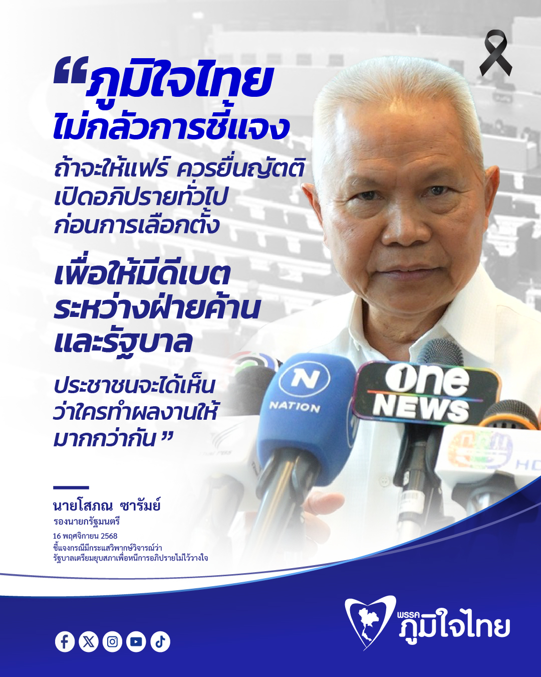 นายโสภณ กล่าวอีกว่า ในฐานะที่เป็นลูกพรรคต้องปกป้องหัวหน้าพรรค ไม่ว่านายกฯ จะคิดอย่างไร พรรคภูมิใจไทยไม่กลัวการชี้แจง ไม่ว่าเรื่องชายแดน ภาษีทรัมป์ สแกมเมอร์ หรือยาเสพติด อยากถามอะไร ก็ถามมาเลย เราจะได้ตอบ