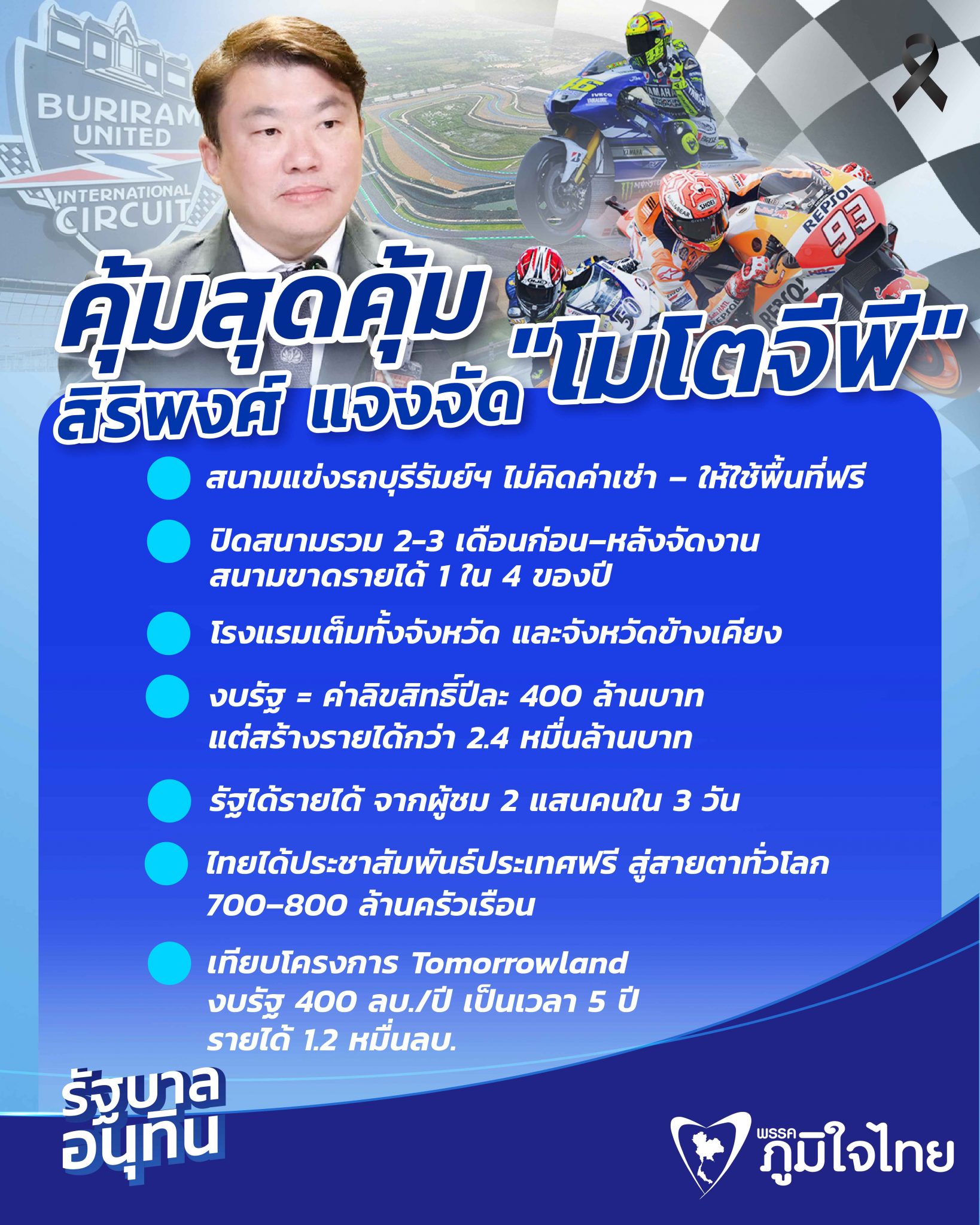 "โครงการที่สร้างผลประโยชน์มากกว่างบที่รัฐลงไปหลายเท่า ทำไมถึงถูกพูดถึงในมุมยกเลิก ทั้งที่ MotoGP ถูกพิสูจน์แล้วว่าคุ้มค่า และสร้างชื่อเสียงประเทศในระดับโลก" นายสิริพงศ์ กล่าว