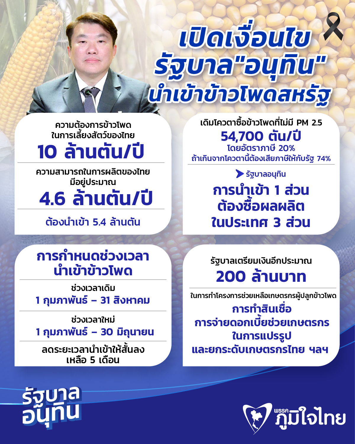 นายสิริพงศ์ กล่าวอีกว่า การนำเข้าข้าวโพด เดิมโควต้าซื้อข้าวโพดที่ไม่มี PM 2.5 จำนวน 54,700 ตัน/ปี โดยอัตราภาษี 20% ถ้าเกินจากโควตานี้ผู้นำเข้าจะต้องเสียภาษีให้กับรัฐ 74% แต่ในรัฐบาลนายอนุทิน ชาญวีรกูล จะมีการนำเข้า 1 ส่วน ต้องซื้อผลผลิตในประเทศ 3 ส่วน โดยจะมีการกำหนดช่วงเวลาการนำเข้าข้าวโพดเลี้ยงสัตว์ จากช่วงเวลาเดิมคือ 1 กุมภาพันธ์ – 31 สิงหาคม เปลี่ยนเป็นช่วงเวลาใหม่คือ 1 กุมภาพันธ์ – 30 มิถุนายน ซึ่งจะลดระยะเวลาในการนำเข้าให้สั้นลง เหลือเพียง 5 เดือน