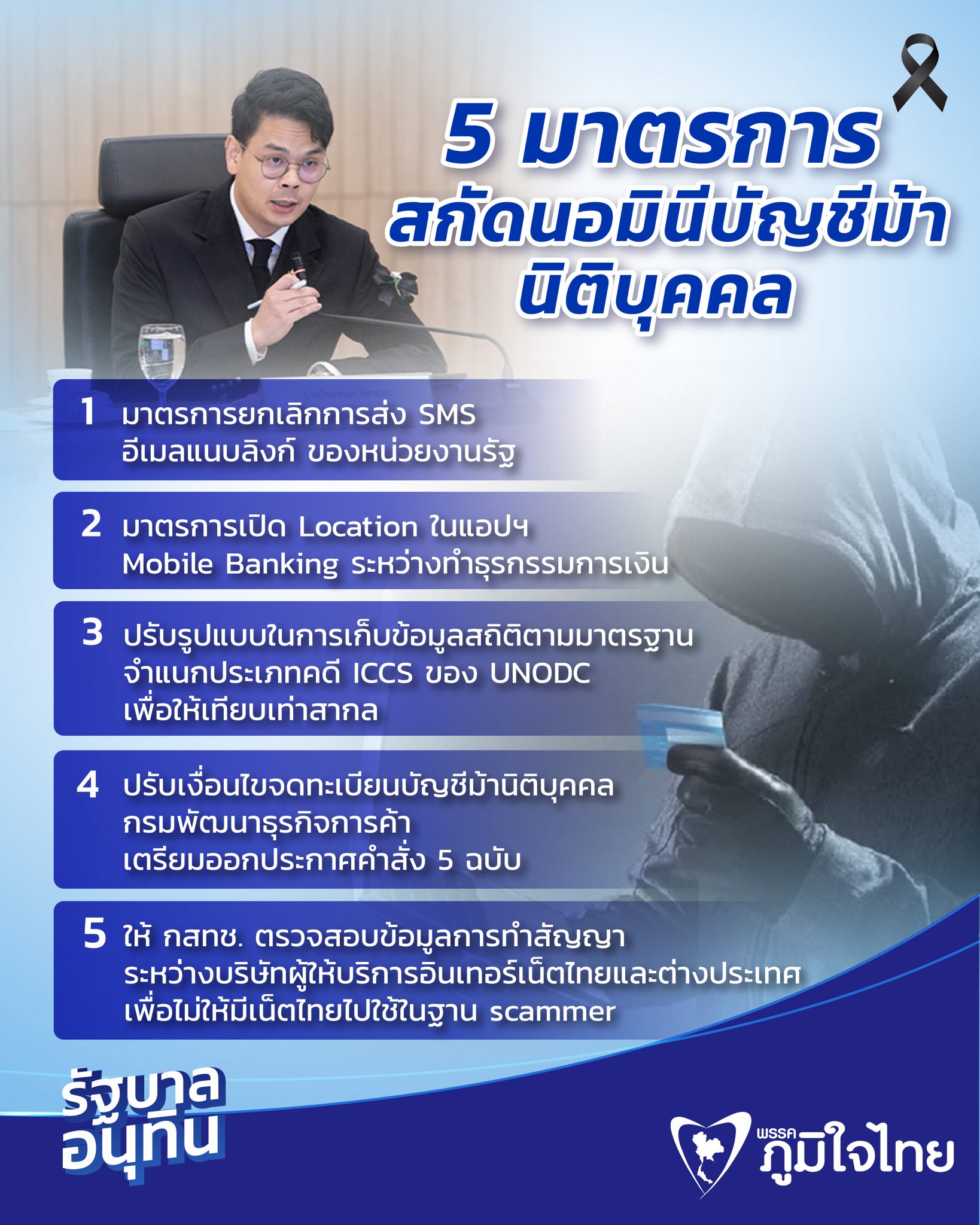 4.มาตรการการปรับเงื่อนไขจดทะเบียนบัญชีม้านิติบุคคล (DBD) กรมพัฒนาธุรกิจการค้า (DBD) กระทรวงพาณิชย์ ได้เตรียมออกประกาศคำสั่ง 5 ฉบับที่เกี่ยวข้องกับการจดทะเบียนนิติบุคคล เพื่อเป็นการป้องกันสแกมเมอร์ใช้ช่องทางการเป็นนิติบุคคลก่ออาชญากรรมออนไลน์ ได้แก่