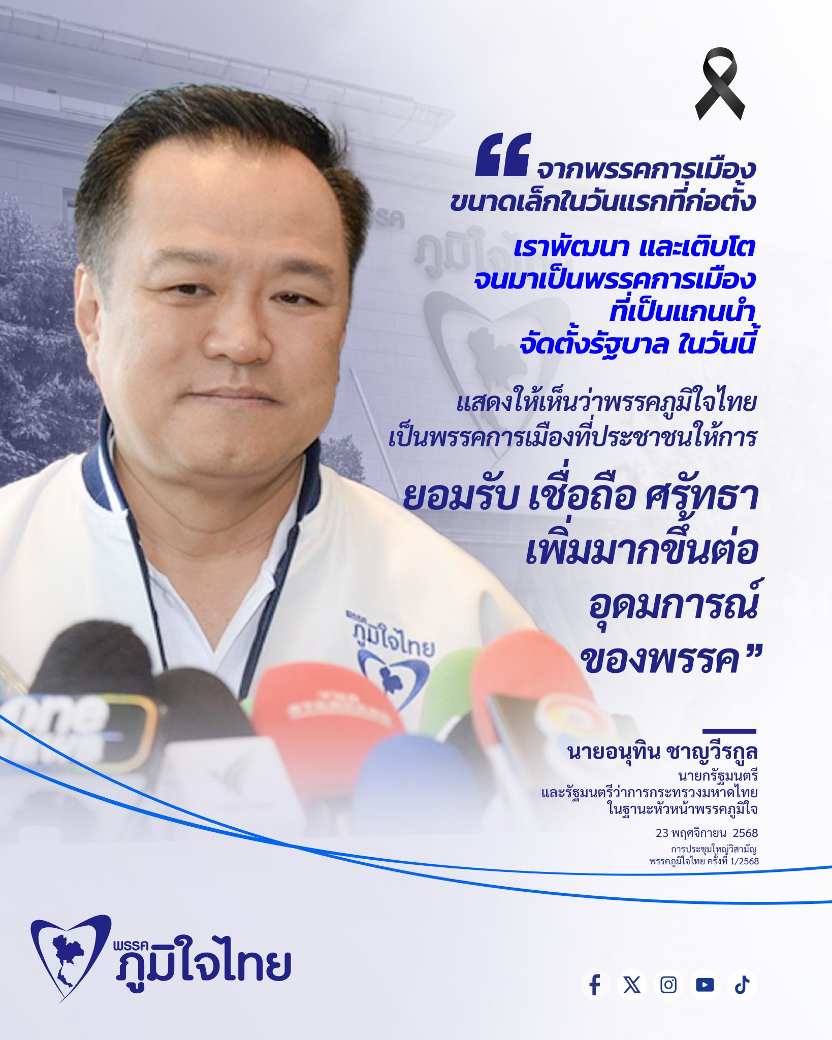 นายอนุทิน กล่าวกับผู้ร่วมประชุมตอนหนึ่งว่า พรรคภูมิใจไทย จากพรรคการเมืองขนาดเล็กในวันแรกที่ก่อตั้ง เราพัฒนา และเติบโต จนมาเป็นพรรคการเมืองที่เป็นแกนนำ จัดตั้งรัฐบาล ในวันนี้ แสดงให้เห็นว่าพรรคภูมิใจไทย เป็นพรรคการเมืองที่ประชาชนให้การยอมรับ เชื่อถือ ศรัทธา เพิ่มมากขึ้น ศรัทธา ต่ออุดมการณ์ของพรรคที่ยึดมั่นการปกครองระบอบประชาธิปไตยอันมีพระมหากษัตริย์ทรงเป็นพระประมุข เชื่อถือ ในแนวนโยบายที่มุ่งเน้นการพัฒนาคุณภาพชีวิตประชาชนให้กินดีอยู่ดี ยอมรับแนวทางการทำงาน “พูดแล้วทำ” อันเป็นอัตลักษณ์ประจำตัวของสมาชิกพรรคภูมิใจไทย ที่พรรคการเมืองอื่นๆ ยากจะเลียนแบบได้