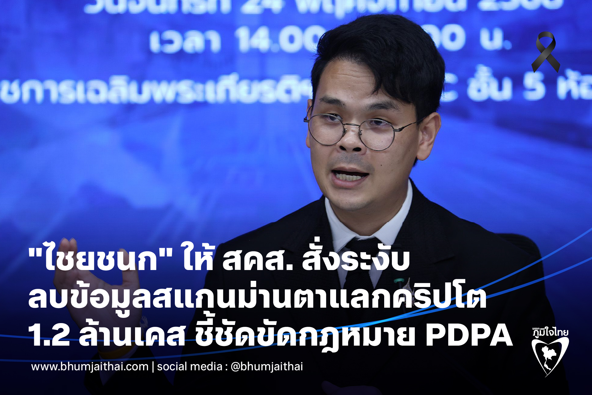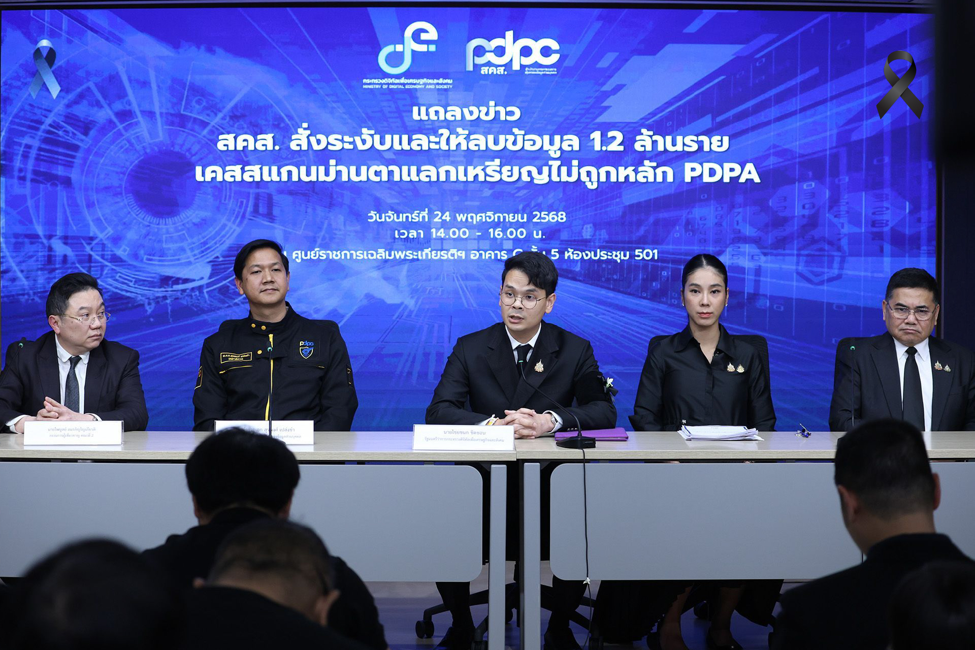 24 พฤศจิกายน 2568 นายไชยชนก ชิดชอบ รัฐมนตรีว่าการกระทรวงดิจิทัลเพื่อเศรษฐกิจและสังคม (ดีอี) พร้อมด้วย นางสาวสุชาดา ซาง แทนทรัพย์ เลขาฯ รมว.ดศ., พันตํารวจเอกสุรพงษ์ เปล่งขํา คณะกรรมการคุ้มครองข้หยุดข้อมูลส่วนบุคคลรั่วไหล! "ไชยชนก" รมว.ดศ. แถลง สคส.สั่งระงับและให้ลบข้อมูล 1.2 ล้านราย เคสสแกนม่านตาแลกเหรียญคริปโต ไม่ถูกหลัก PDPA พร้อมส่ง DSI ขยายผล