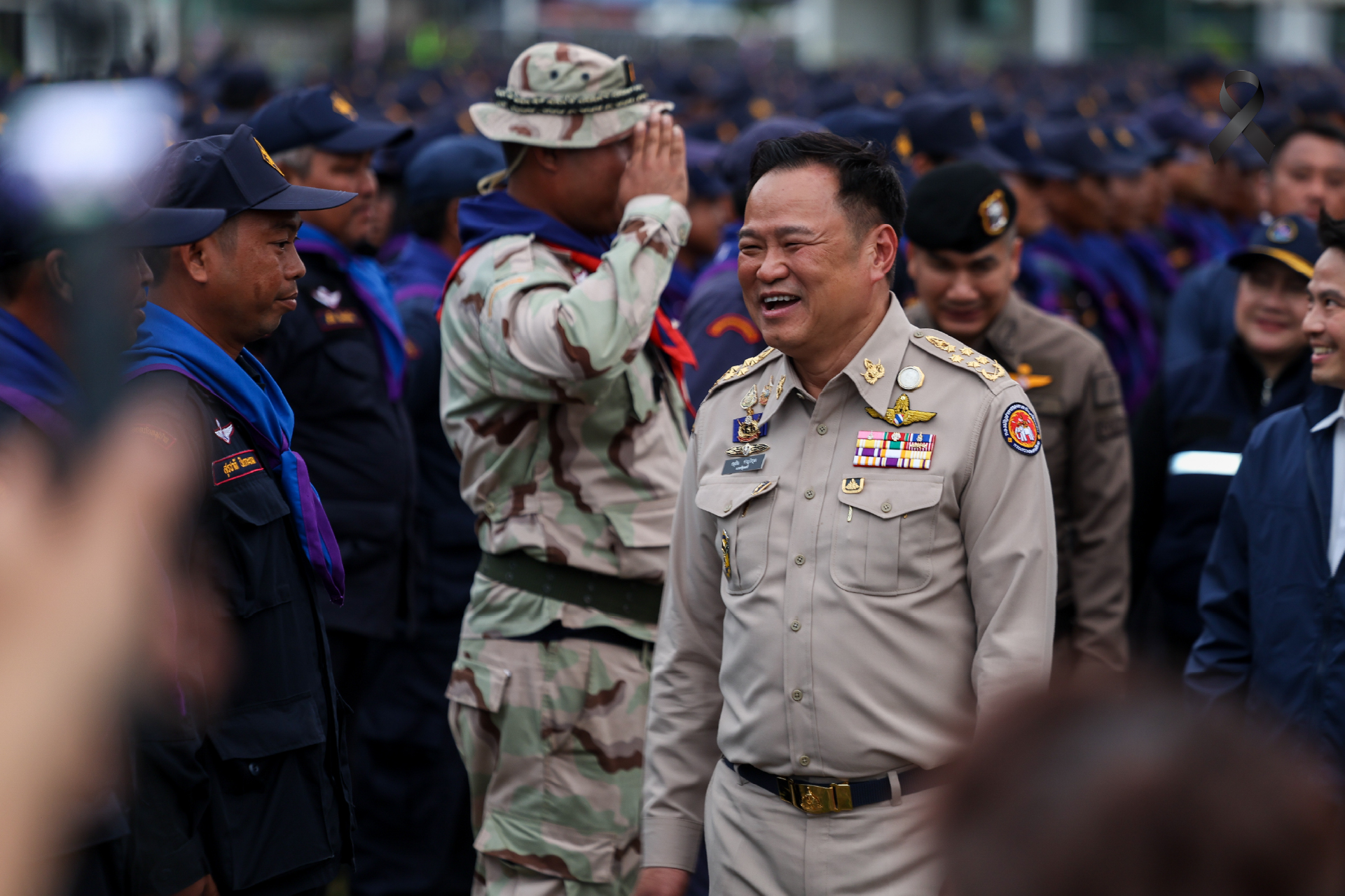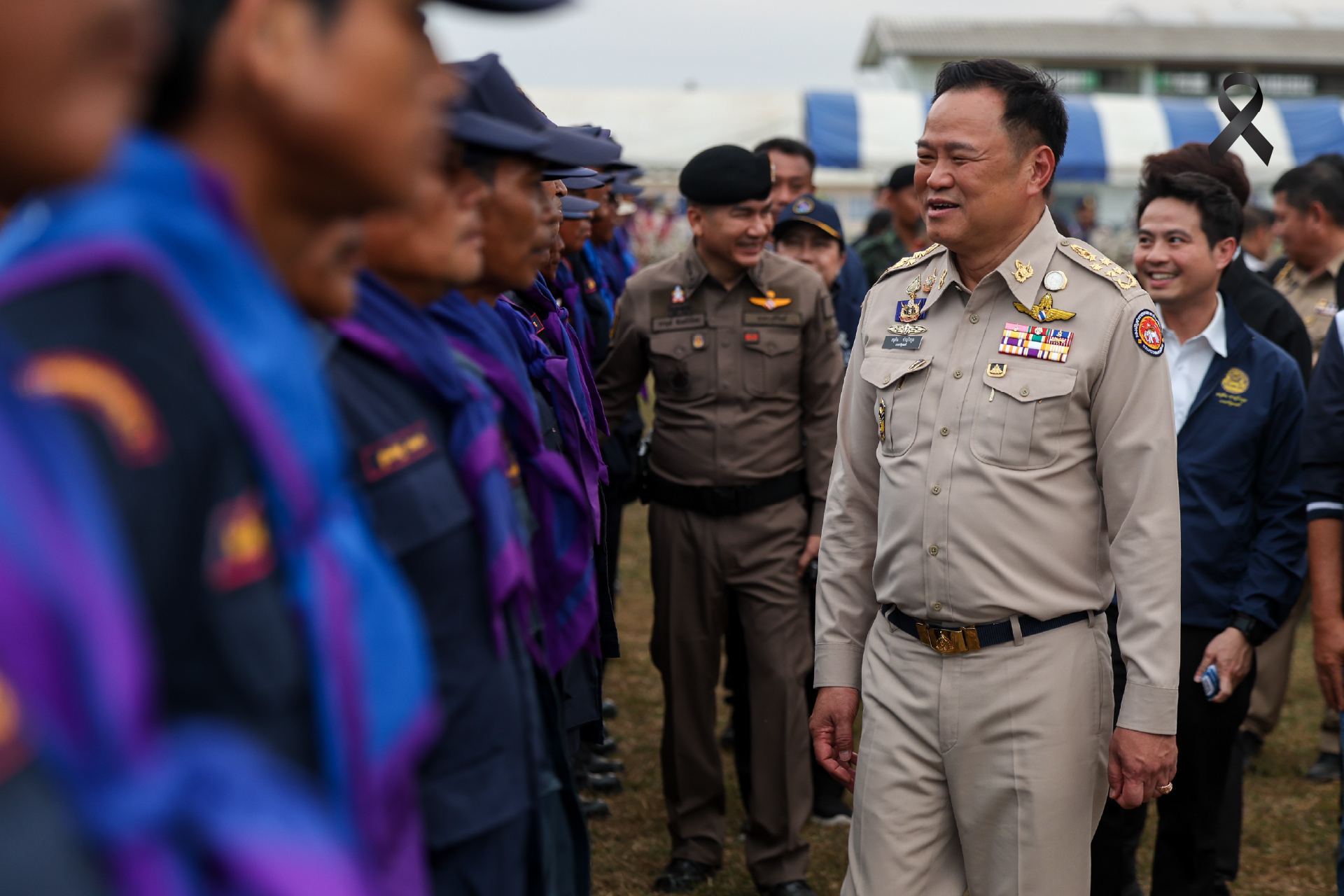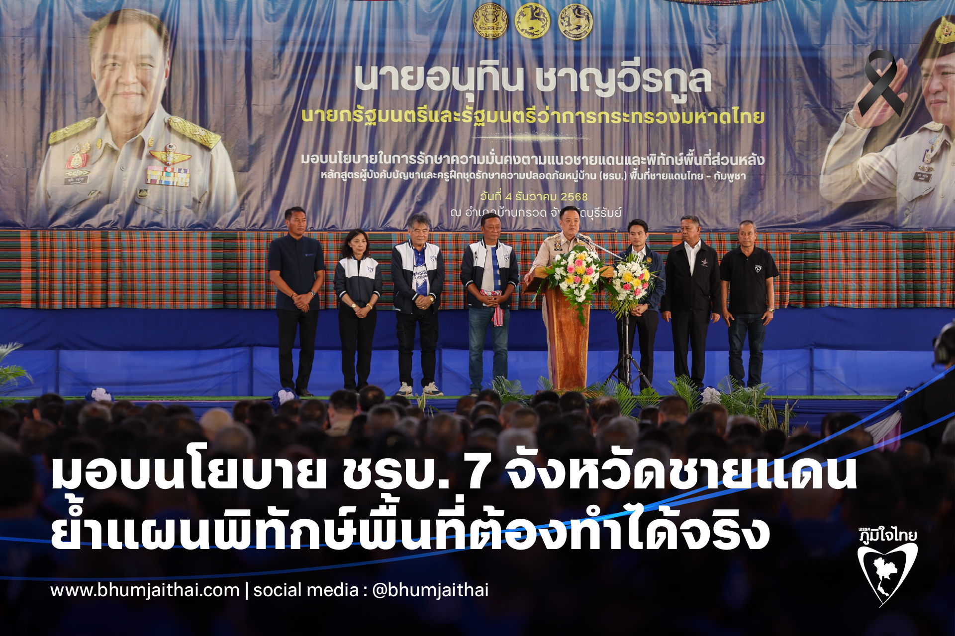 วันที่ 4 ธันวาคม 2568 ที่โดมอเนกประสงค์ เทศบาลตลาดนิคมปราสาท อำเภอบ้านกรวด จังหวัดบุรีรัมย์ นายอนุทิน ชาญวีรกูล นายกรัฐมนตรีและรัฐมนตรีว่าการกระทรวงมหาดไทย เป็นประธานมอบนโยบายการรักษาความมั่นคงตามแนวชายแดนและพิทักษ์พื้นที่ส่วนหลัง ให้แก่ผู้บังคับบัญชาและครูฝึกชุดรักษาความปลอดภัยหมู่บ้าน (ชรบ.) ในพื้นที่ชายแดนไทย–กัมพูชา มีผู้ว่าราชการจังหวัด เจ้าหน้าที่ฝ่ายปกครอง และชรบ.กว่า 2,000 นาย จาก 7 จังหวัดชายแดน ได้แก่ บุรีรัมย์ สุรินทร์ ศรีสะเกษ อุบลราชธานี สระแก้ว จันทบุรี และตราด เข้าร่วมรับฟังนโยบายอย่างพร้อมเพรียง