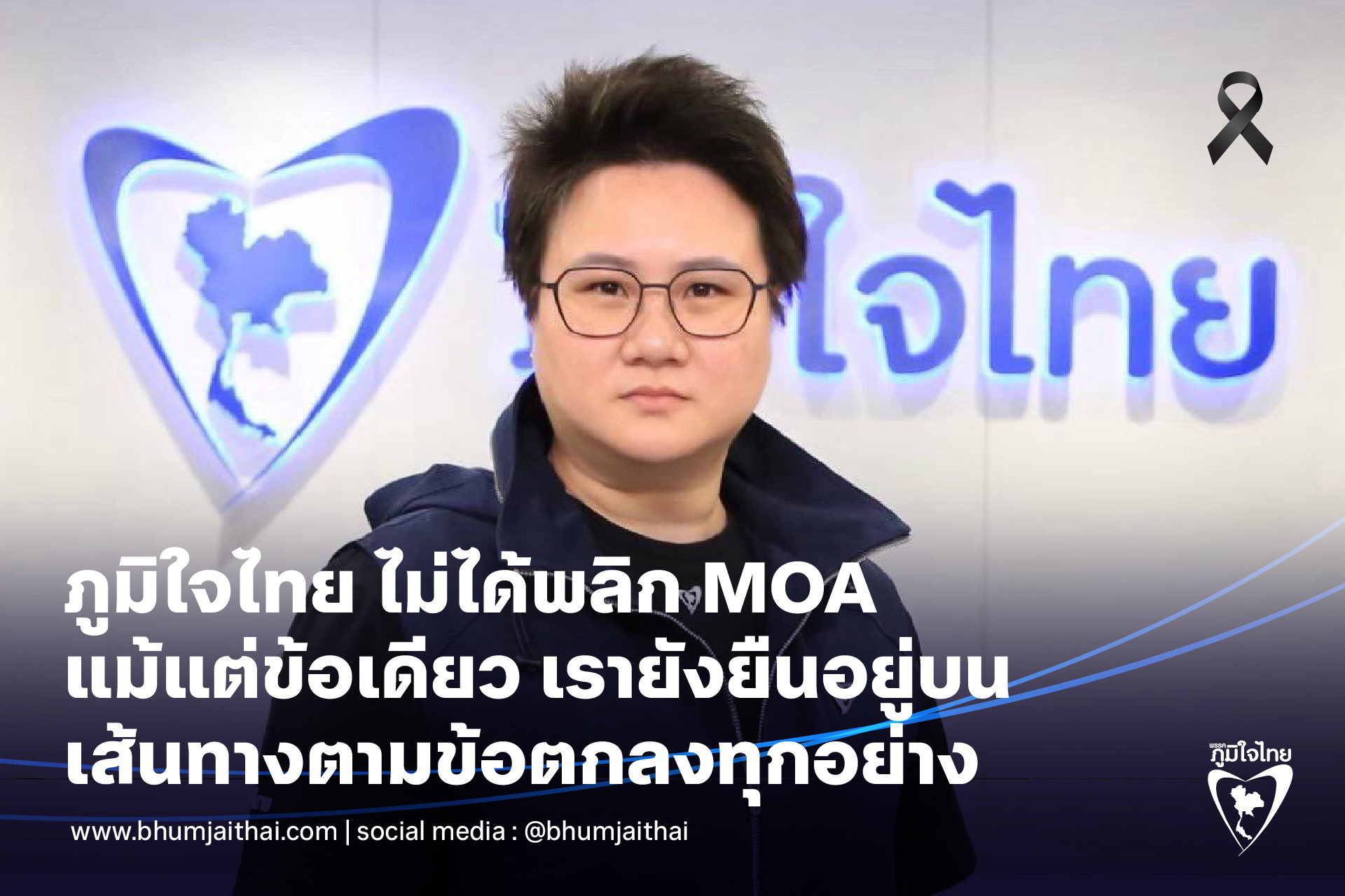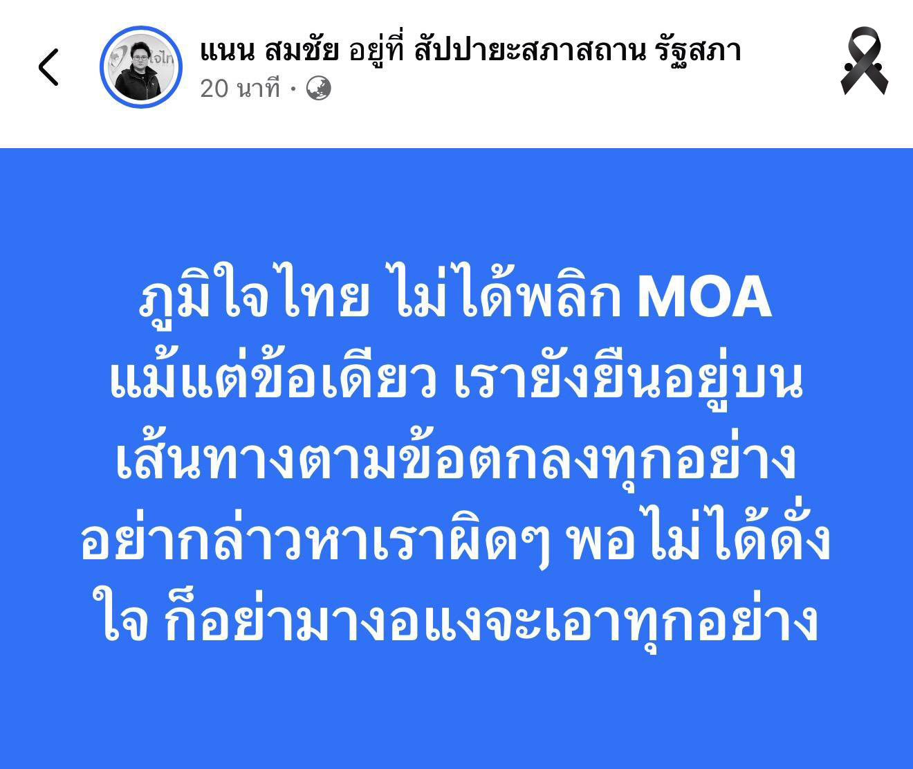 ล่าสุด น.ส.แนน บุณย์ธิดา สมชัย สส.อุบลราชธานี ในฐานะโฆษกพรรคภูมิใจไทย โพสต์ข้อความผ่านเฟซบุ๊กส่วนตัว ระบุว่า ภูมิใจไทย ไม่ได้พลิก MOA แม้แต่ข้อเดียว เรายังยืนอยู่บนเส้นทางตามข้อตกลงทุกอย่าง อย่ากล่าวหาเราผิดๆ พอไม่ได้ดั่งใจ ก็อย่ามางอแงจะเอาทุกอย่าง