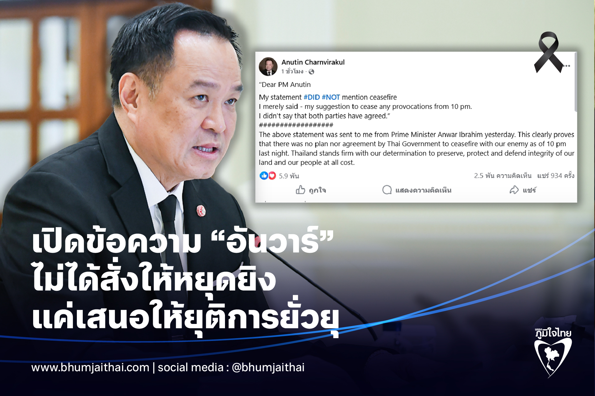 นายอนุทิน ยังระบุว่า คำแถลงข้างต้นถูกส่งมาถึงจากนายกรัฐมนตรี อันวาร์ อิบราฮิม เมื่อวานนี้ ซึ่งพิสูจน์ได้อย่างชัดเจนว่ารัฐบาลไทยไม่มีแผนหรือข้อตกลงใดๆ ที่จะหยุดยิงกับศัตรูของเราตั้งแต่เวลา 22.00 น.ของเมื่อคืนนี้ ประเทศไทยยืนหยัดอย่างมั่นคงในความมุ่งมั่นที่จะรักษา ปกป้อง และพิทักษ์บูรณภาพของแผ่นดินและประชาชนของเราอย่างสุดกำลัง
