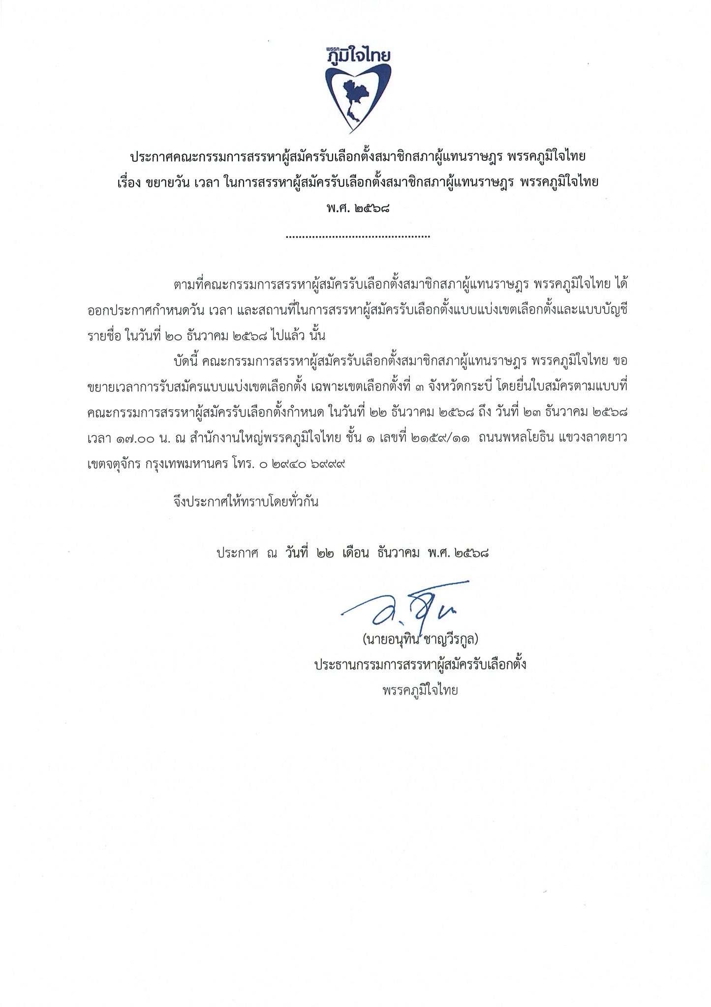 22 ธันวาคม 2568 เวลา 10:00ประกาศคณะกรรมการสรรหาผู้สมัครรับเลือกตั้งสมาชิกสภาผู้แทนราษฎร พรรคภูมิใจไทย เรื่อง ขยายวัน เวลา ในการสรรหาผู้สมัครรับเลือกตั้งสมาชิกสภาผู้แทนราษฎร พรรคภูมิใจไทย พ.ศ. ๒๕๖๘แชร์บทความนี้: