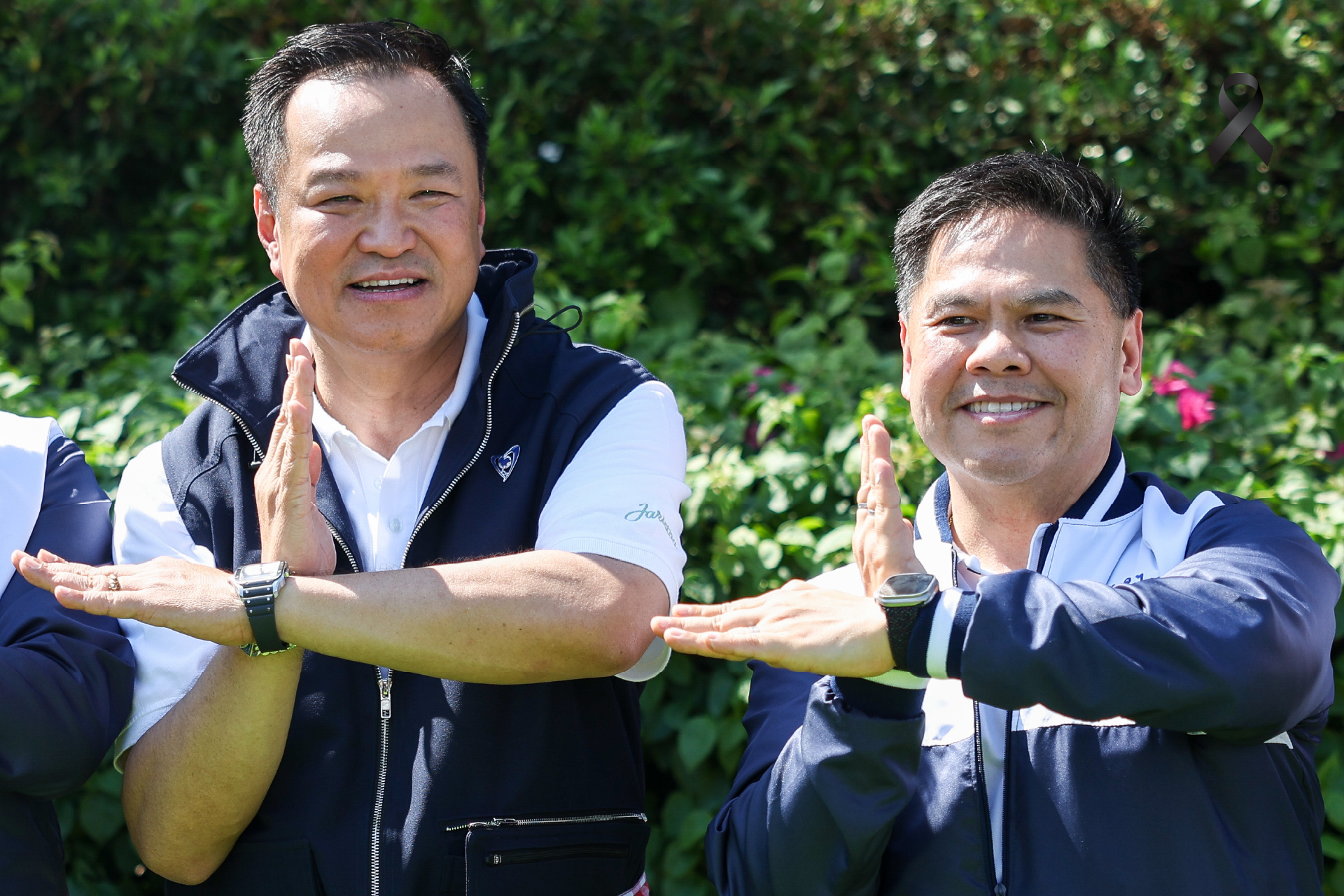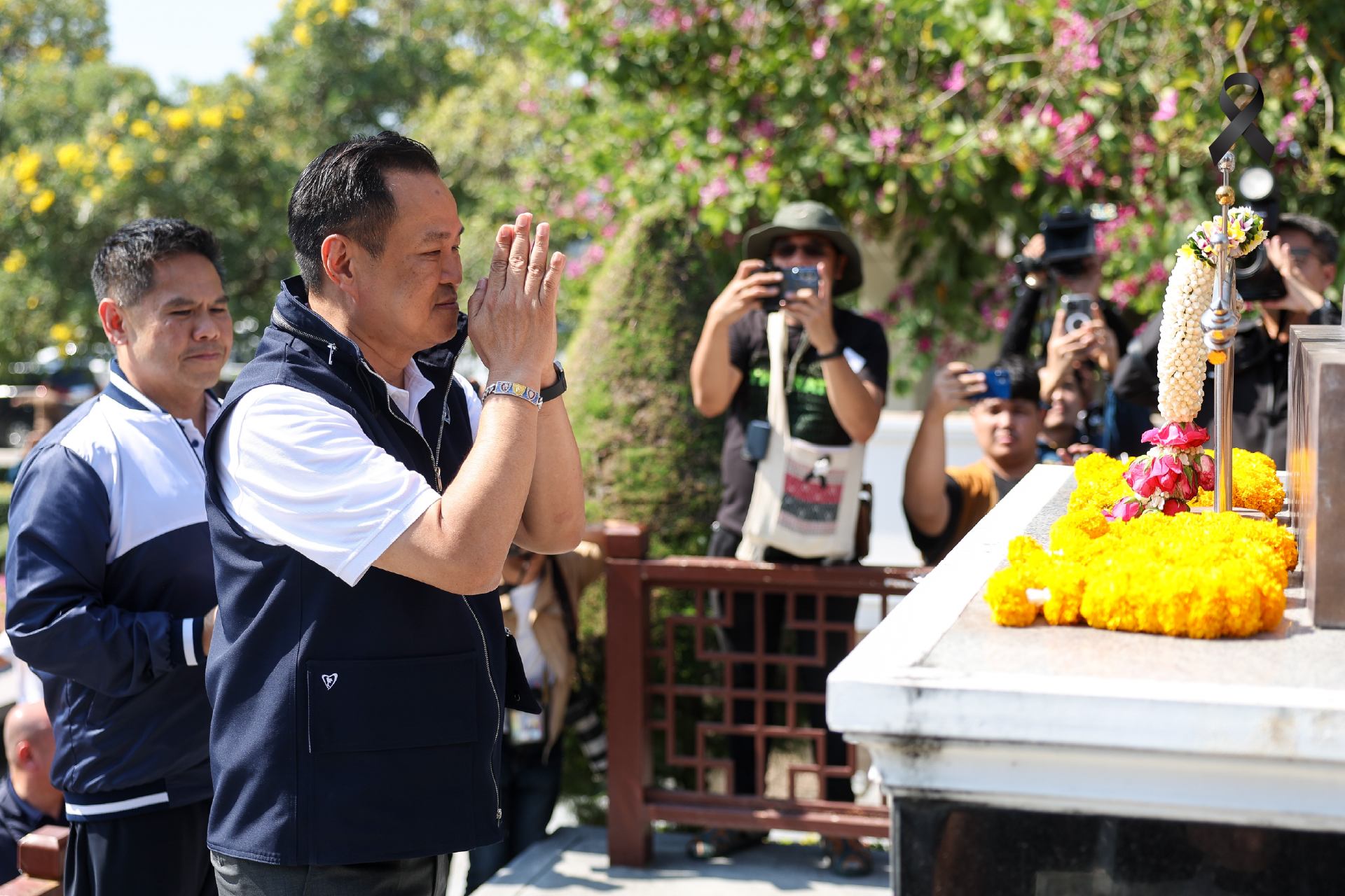 นายอนุทินและนายวราวุธ ได้ร่วมวางพวงดอกไม้และคารวะอนุสาวรีย์นายบรรหาร ก่อนถ่ายภาพร่วมกับแกนนำพรรคและผู้สมัคร สส. ในพื้นที่ จากนั้นนายอนุทินได้ถ่ายภาพร่วมกับนายวราวุธและบุตรชาย บริเวณด้านหน้าอนุสาวรีย์ พร้อมแสดงสัญลักษณ์ความพร้อมในการสู้ศึกเลือกตั้ง
