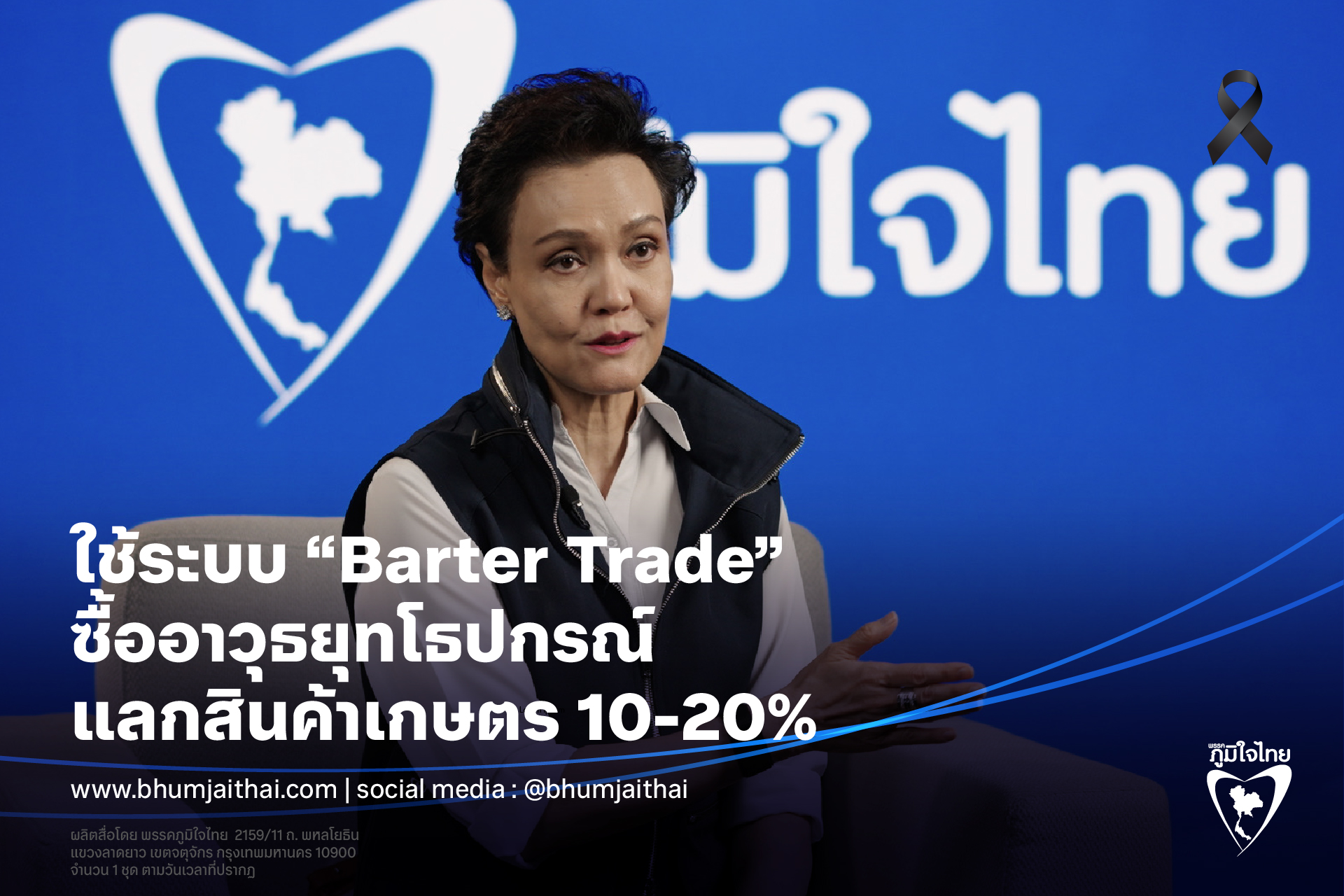 นางศุภจี สุธรรมพันธุ์ ผู้ช่วยหาเสียงพรรคภูมิใจไทย แคนดิเดต รองนายกรัฐมนตรี และรัฐมนตรีว่าการกระทรวงพาณิชย์ จากพรรคภูมิใจไทย กล่าวถึงมุมมองในเรื่องของการค้าการขายระหว่างประเทศ โดยใช้ระบบ BarterTrade ว่า ส่วนมากคนจะมองว่าถ้าเราเป็นแม่ค้าจะขายอะไร แต่สิ่งที่ควรจะดูด้วยคือ แล้วเราซื้ออะไร ถ้าดูตอนนี้เรามีความต้องการจำนวนมากในการจะซื้อ ยกตัวอย่างเช่น อาวุธยุทโธปกรณ์ ซึ่งจะดีหรือไม่ ถ้าเราเจรจาเงื่อนไขเพราะคนที่ขายอาวุธยุทโธปกรณ์ในโลกไม่ได้มีประเทศเดียว สมมุติว่าหากตั้งใจจะซื้อ ก็บอกเขาว่าขอได้หรือไม่ ให้ซื้อสินค้าเกษตร จากประเทศไทยส่วนหนึ่ง ไม่ต้องเยอะ อย่างน้อย 10-20% ถ้าได้มากก็เป็นเรื่องดี โดยขอใช้เป็นสินค้าของเราที่จะส่งให้เขา แลกกันไม่ใช่ใช้เงินสดซื้ออย่างเดียว ซึ่งจะทำให้เราสามารถมีบรรทัดฐาน ในการซื้อสินค้าของเรา สามารถที่จะจบลง เจรจาแล้วมีโครงสร้างในการพูดคุยกันได้ ซึ่งปัจจุบันนี้มีการพูดคุยกันแล้วว่าเป็นอีกเรื่องหนึ่ง ที่ต้องทำ และสานต่อให้สำเร็จ