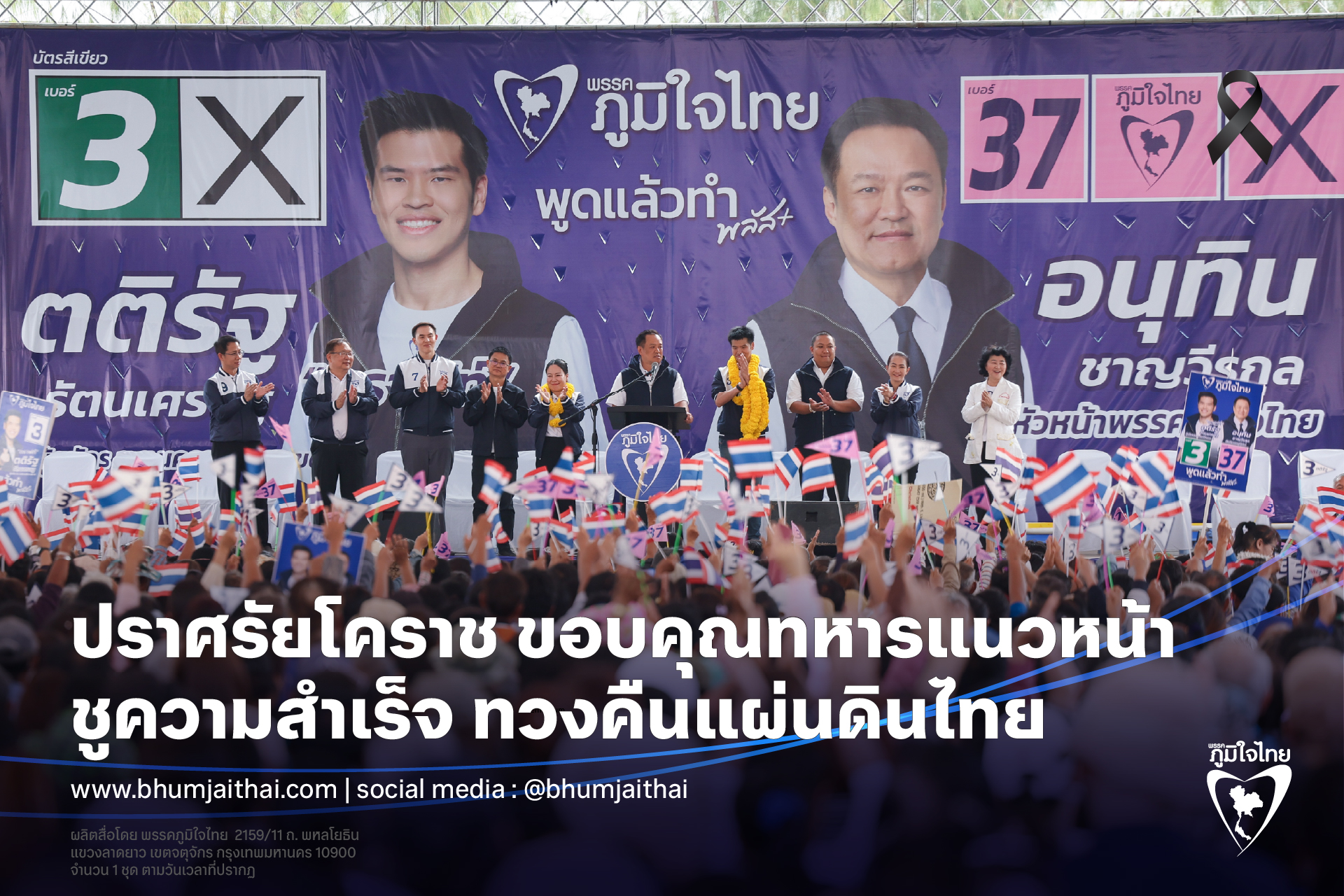 “อนุทิน” ปราศรัยโคราช ชู ความสำเร็จทวงคืนแผ่นดินไทย ปิดด่าน สกัดของเถื่อน ดันราคาข้าว-มัน ขยับขึ้น ขอบคุณทหารแนวหน้า ย้ำ หากได้กลับมา ประชาชน ได้คนละครึ่งพลัส ประเทศไทย ได้ความมั่นคง 3 มิติ ทหาร เศรษฐกิจ อาหาร