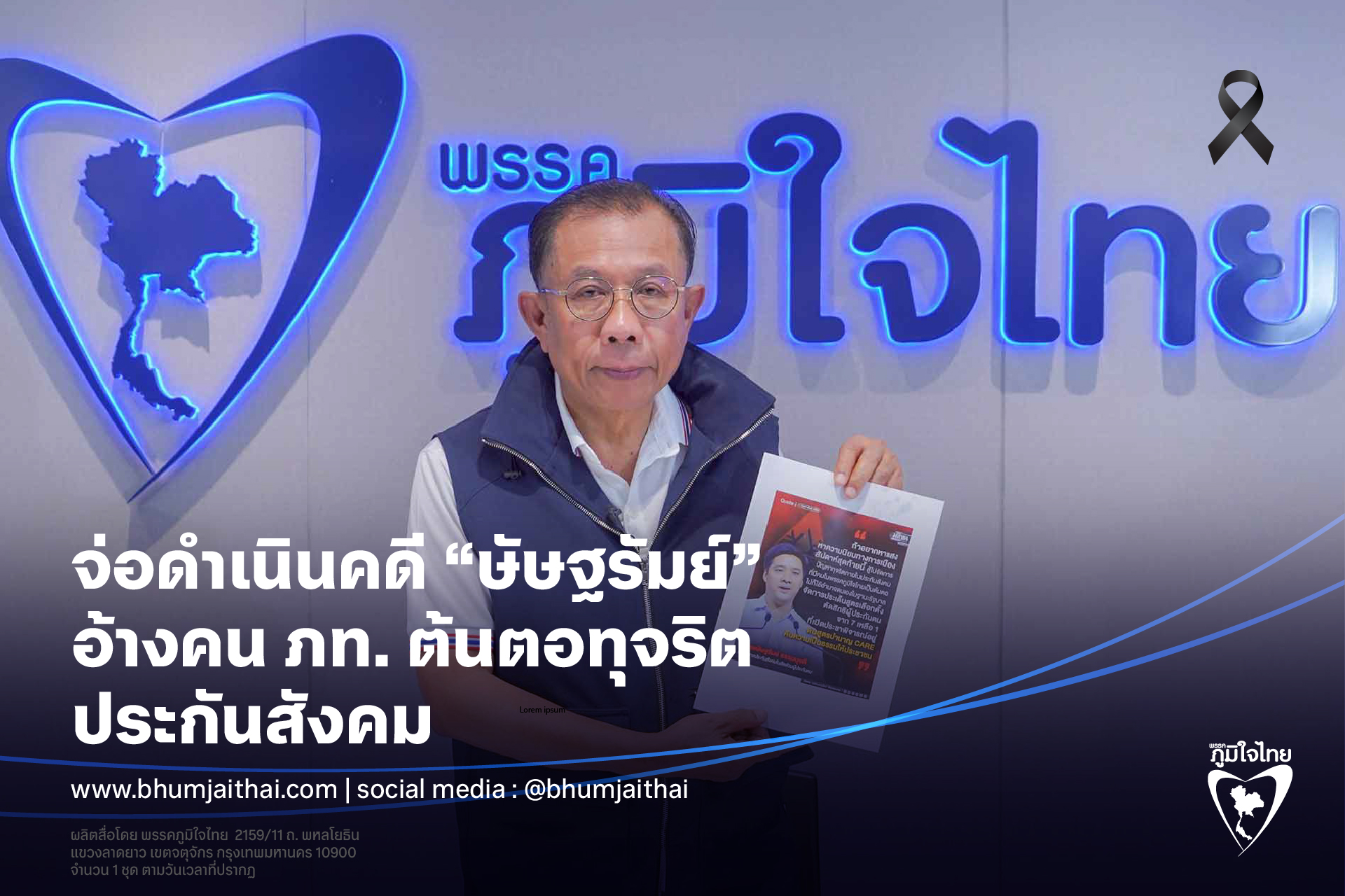 นายศุภชัย ใจสมุทร ผู้สมัครสส.บัญชีรายชื่อ และประธานคณะทำงานด้านกฎหมายพรรคภูมิใจไทย แถลงข่าวกรณีที่วันนี้มีข่าวที่ปรากฏตามสื่อต่างๆ โดยนายษัษฐรัมย์ ธรรมบุษดี ที่เป็นกรรมการประกันสังคมในสัดส่วนของผู้ประกันตน และเคยเป็นผู้ก่อตั้งพรรคอนาคตใหม่ ได้มีการระบุว่าถ้าอยากหาแสง หาความนิยมทางการเมืองสัปดาห์สุดท้ายนี้ สู้ไปจัดการปัญหาทุจริตภายในประกันสังคมที่มีคนในพรรคภูมิใจไทยต้นตอ หรือไม่ก็ใช้อำนาจของตัวเองในฐานะรัฐบาลจัดการศูนย์เลือกตั้งว่า การที่กล่าวอ้างว่าปัญหาทุจริตภายในประกันสังคมที่มีคนภายในพรรคภูมิใจไทยเป็นต้นตอ ถือเป็นการใส่ร้ายด้วยข้อความอันเป็นเท็จต่อพรรคภูมิใจไทย ซึ่งฝ่ายกฎหมายของพรรค จะพิจารณาดำเนินคดีกับนายษัษฐรัมย์ ในเรื่องนี้ต่อไป