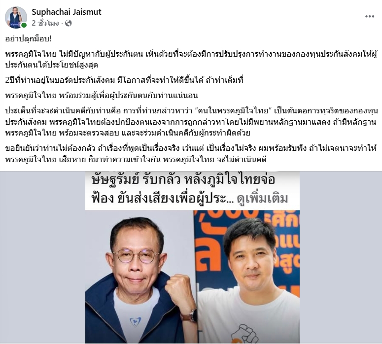 อย่าปลุกม็อบ ! "ศุภชัย" ยันภูมิใจไทยพร้อมหนุนผู้ประกันตน แต่ต้องปกป้องพรรคจากข้อกล่าวหาเป็นต้นตอการทุจริต ยินดีรับฟังหากไร้เจตนาทำลายชื่อเสียง