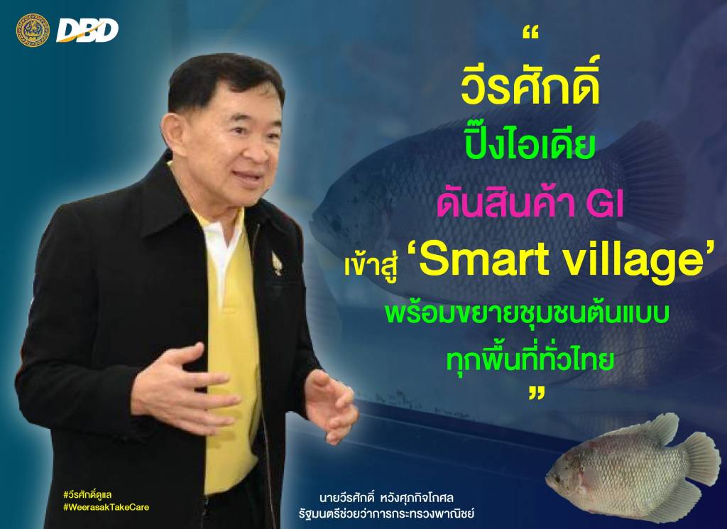 นายวีรศักดิ์ หวังศุภกิจโกศล รัฐมนตรีช่วยว่าการกระทรวงพาณิชย์ เปิดเผยว่า ขณะนี้ตนได้สั่งการให้กรมพัฒนาธุรกิจการค้าและกรมทรัพย์สินทางปัญญา หารือถึงแนวทางการบูรณาเพื่อช่วยกันผลักดันผู้ประกอบธุรกิจและสินค้าที่ได้รับเครื่องหมายสิ่งบ่งชี้ทางภูมิศาสตร์ หรือ GI จากกรมทรัพย์สินทางปัญญาให้กลายไปเป็น ผู้ประกอบธุรกิจมืออาชีพและสร้างชุมชนที่เข้มแข็งให้ยั่งยืน มีช่องทางการจำหน่ายสินค้าที่มากขึ้นด้วยการใช้เทคโนโลยี ซึ่งจะสอดรับกับโครงการ Smart Village Online ของกรมพัฒนาธุรกิจการค้า ที่มีวัตถุประสงค์เพื่อผลักดันสินค้าชุมชนเข้าสู่โลกของการค้าออนไลน์ ปัจจุบันมีชุมชนต้นแบบ 5 แห่งแรกของประเทศไทยที่ประสบความสำเร็จแล้ว คือ
