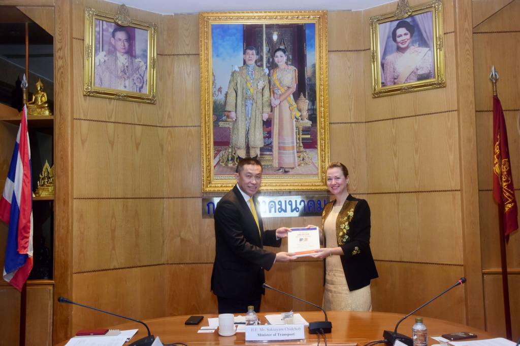 21 ตุลาคม 2562 เวลา 17:09"ศักดิ์สยาม" ให้ประธานหอการค้าอเมริกันในประเทศไทยเข้าพบ หารือความร่วมมือด้านความปลอดภัยทางถนนและการลงทุนโครงสร้างพื้นฐานในพื้นที่ EECนายศักดิ์สยาม ชิดชอบ รัฐมนตรีว่าการกระทรวงคมนาคม ให้ Ms. Heidi Gallant ประธานหอการค้าอเมริกันในประเทศไทย (AMCHAM) และคณะเข้าพบ เพื่อแสดงความยินดีในโอกาสเข้ารับตำแหน่งรัฐมนตรีว่ากระทรวงคมนาคม รวมทั้งหารือในประเด็นความร่วมมือด้านความปลอดภัยทางถนน เพื่อลดความสูญเสียอันเนื่องมาจากอุบัติเหตุ และโอกาสทางธุรกิจของภาคเอกชนอเมริกันในประเทศไทยต่อการพัฒนาโครงสร้างพื้นฐานในพื้นที่เขตพัฒนาพิเศษภาคตะวันออก (EEC) โดยมี นายชยธรรม์ พรหมศร ผู้อำนวยการสำนักงานนโยบายและแผนการขนส่งและจราจร ผู้แทนจากกรมการขนส่งทางบก กรมทางหลวง กรมทางหลวงชนบท และสำนักงานปลัดกระทรวงคมนาคม เข้าร่วมประชุม ในวันที่ 21 ตุลาคม 2562 เวลา 14.00 น. ณ ห้องประชุมกระทรวงคมนาคม รัฐมนตรีว่าการกระทรวงคมนาคม กล่าวว่า กระทรวงคมนาคมให้ความสำคัญกับความปลอดภัยทางถนนเป็นลำดับต้น ๆ เนื่องจากประเทศไทยมีสถิติอุบัติเหตุทางถนนค่อนข้างสูง เป็นอันดับที่ 9 ของโลก มีผู้เสียชีวิตจากอุบัติเหตุทางถนน 30 คนต่อประชากรแสนคน โดยมีเป้าหมายลดจำนวนผู้เสียชีวิตให้ต่ำกว่า 10 คนต่อประชากรแสนคน ขณะนี้กระทรวงคมนาคมได้ศึกษาสาเหตุการเกิดอุบัติเหตุพบว่า มี 3 สาเหตุหลัก ๆ ได้แก่ 1) ผู้ขับ 2) ยานพาหนะ และ 3) สภาพถนน โดยได้เริ่มต้นโครงการสร้างความปลอดภัยทางถนนกับรถโดยสารสาธารณะ จัดตั้งจุด Checking point เพื่อตรวจคน ตรวจรถ และสภาพผู้ขับรถโดยสารระหว่างการให้บริการประชาชน เริ่มดำเนินการตั้งแต่วันที่ 16 กันยายน 2562 ถึงปัจจุบัน สามารถลดสถิติการเกิดอุบัติเหตุกับรถโดยสารสาธารณะได้จาก 1.06 ครั้งต่อวัน เหลือ 0.4 ครั้งต่อวัน ทั้งนี้ เมื่อช่วงเช้าที่ผ่านมาได้ไปตรวจเยี่ยมกรมการขนส่งทางบก (ขบ.) และมอบนโยบายให้เคร่งครัด ตรวจสอบคุณสมบัติผู้ขอรับใบอนุญาตขับรถ การนำระบบตัดคะแนนมาใช้ การตรวจสอบคุณสมบัติ ความพร้อมของรถที่มาจดทะเบียนหรือต่อภาษีรถประจำปี โดยเฉพาะรถโดยสาร ซึ่ง ขบ. ได้ติดตั้งระบบ GPS กับรถโดยสาร เพื่อติดตามพฤติกรรมการขับรถ และได้มอบให้ ขบ. ศึกษาเพิ่มเติมเพื่อนำระบบดังกล่าวมาใช้กับรถส่วนบุคคล รถจักรยานยนต์ ให้แล้วเสร็จภายใน 2 เดือน โดยจะหารือกับกระทรวงอุตสาหกรรมว่าจะสามารถติดตั้งระบบ GPS มาพร้อมกับรถได้หรือไม่ แต่ต้องไม่สร้างภาระให้กับผู้ซื้อรถ ไม่กระทบกับสิทธิส่วนบุคคล รวมทั้งการเปิดโอกาสให้ภาคประชาชนมามีส่วนร่วม โดยสร้างแรงจูงใจหรือผลตอบแทนให้แก่ป