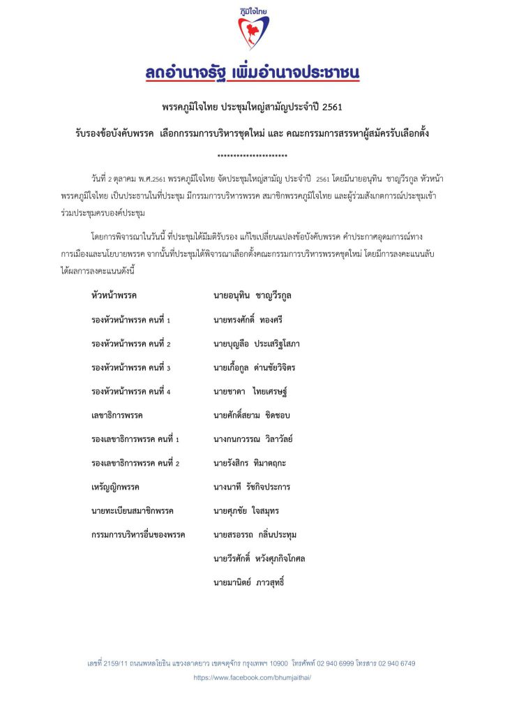 พรรคภูมิใจไทย ประชุมใหญ่สามัญประจำปี 2561 รับรองข้อบังคับพรรค เลือกกรรมการบริหารชุดใหม่ และ คณะกรรมการสรรหาผู้สมัครรับเลือกตั้ง