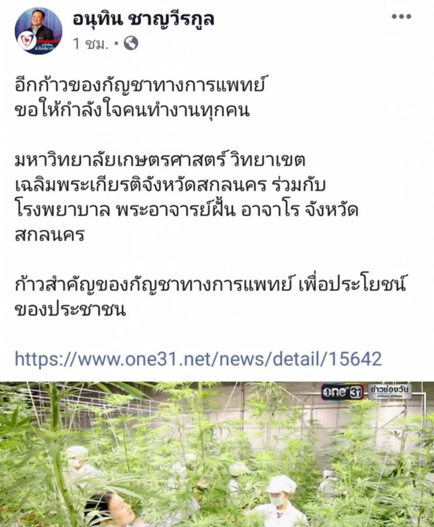 ซึ่งนายอนุทิน แชร์ข่าวที่นักวิชาการมหาวิทยาลัยเกษตรศาสตร์ วิทยาเขตเฉลิมพระเกียรติ จังหวัดสกลนคร ปลูกต้นกัญชา และเก็บเกี่ยวส่งให้โรงพยาบาล พระอาจารย์ฝั้น อาจาโร จังหวัดสกลนคร นำไปผลิตยารักษาโรค