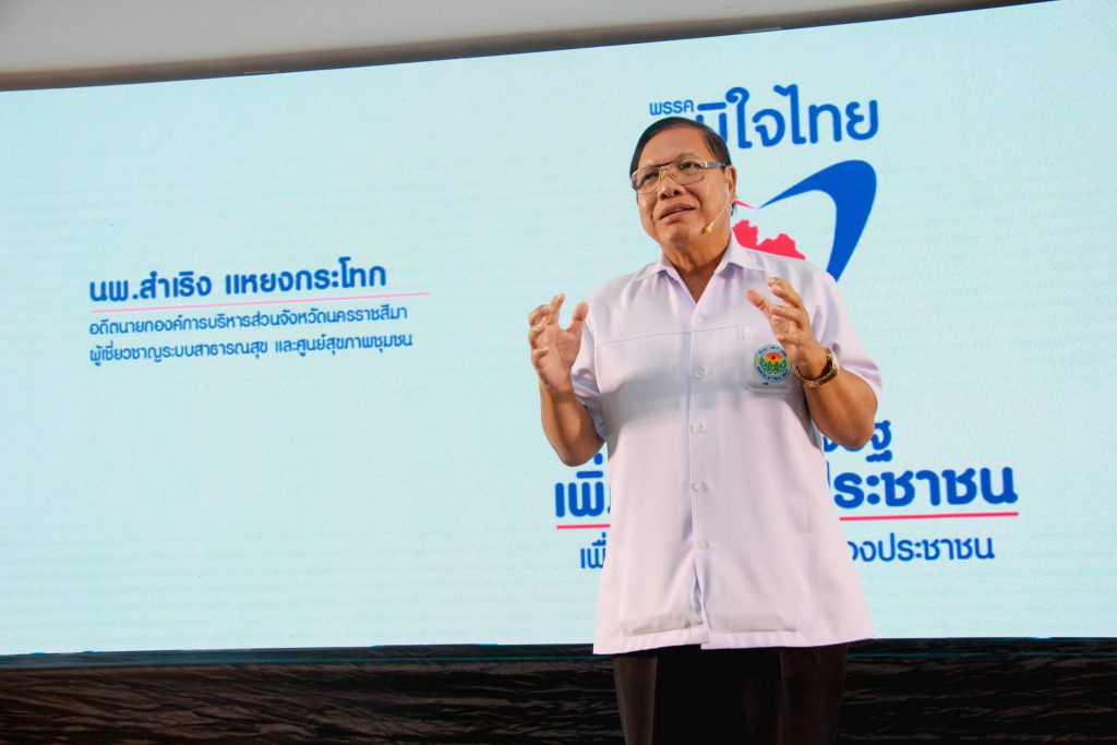 การทำงานด้านสาธารณสุขมูลฐาน โดยกลไก อสม. นี้ ได้มอบหมายให้นพ.สำเริง แหยงกระโทก ซึ่งเป็นบุคลากรทางสาธารณสุข ที่ทำงานด้านนี้มามากกว่า 30 ปี มาเป็นผู้ขับเคลื่อนแนวคิดสู่ แนวนโยบายของพรรคต่อไป